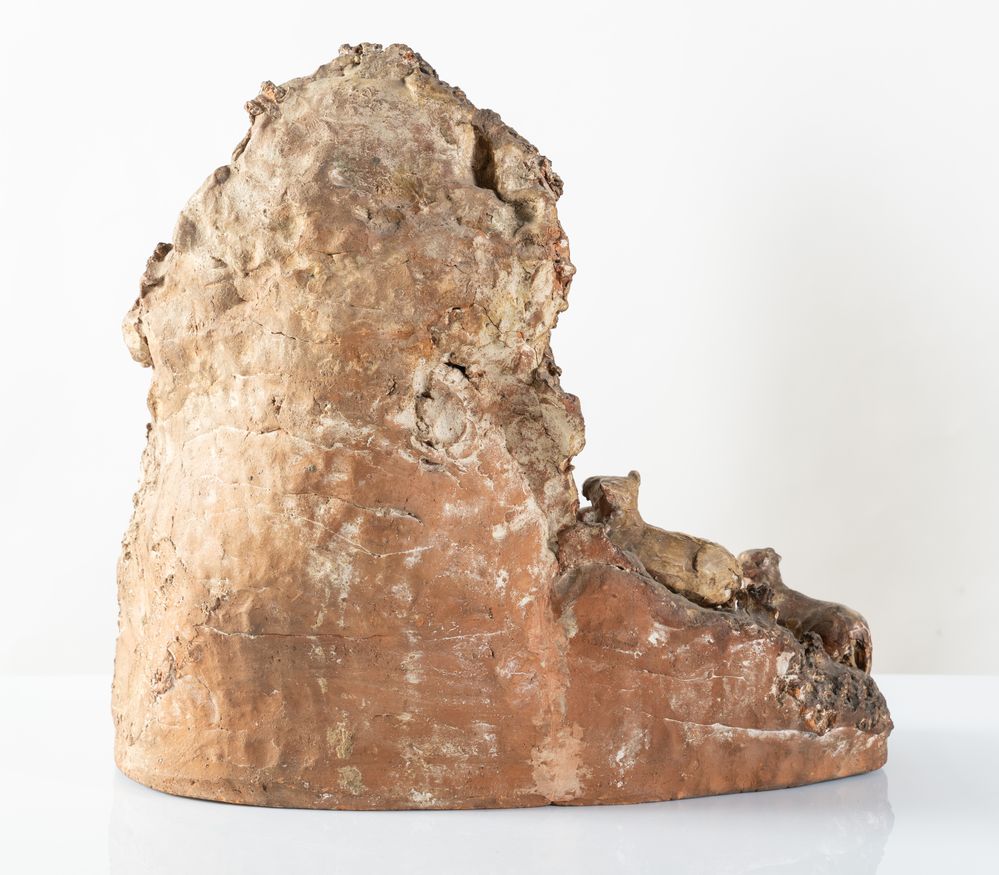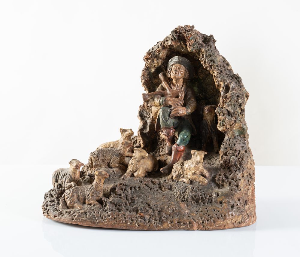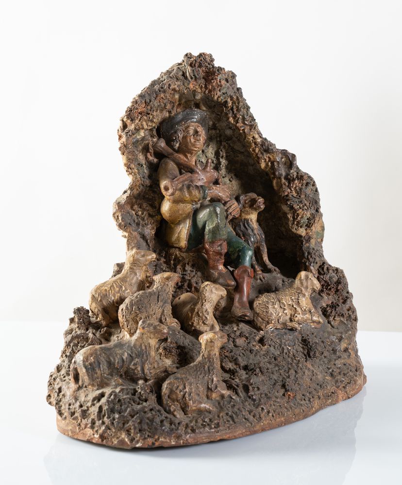 Presepe in terracotta, raffigurante figura di pastore con zampogna, cane e pecore. Arte emiliana, fine del XVIII secolo. Cm 47x43x27.