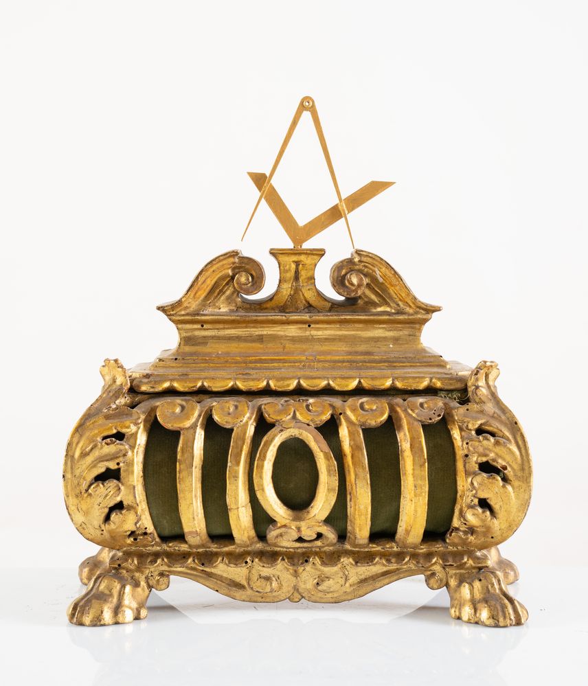 Piccola cassetta porta-reliquie in legno intagliato e dorato, convertita a contenitore con simbolo massonico. Stato pontificio, fine del XVI secolo - inizi del XVII secolo. Cm 34,5x28,5x12.