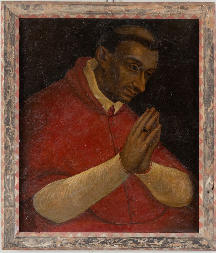 Maestro del XVII secolo. "San Carlo Borromeo". Olio su tela. Cm 66x55. Cornice laccata. (restauri)