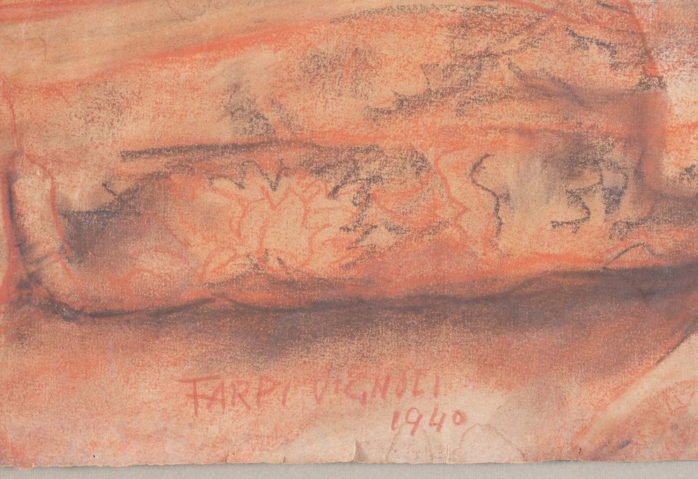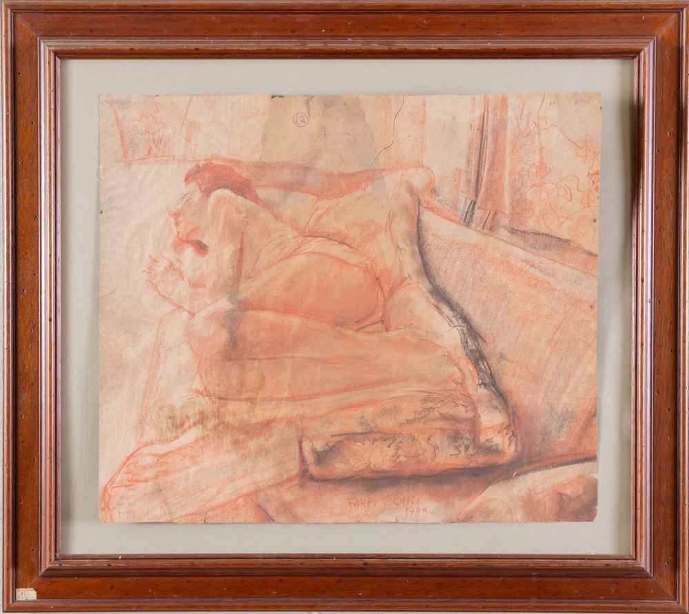 FARPI VIGNOLI (Bologna 1907 – 1997) "Donna distesa sul divano", 1940. Sanguigna su carta. Cm 44,5x51,5. Opera firmata e datata in basso al centro Farpi Vignoli 1940.