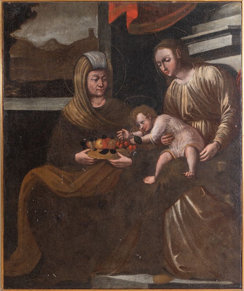 Maestro del XVII secolo. "Madonna con Bambino e Sant'Anna". Olio su tela. Cm 99x83.