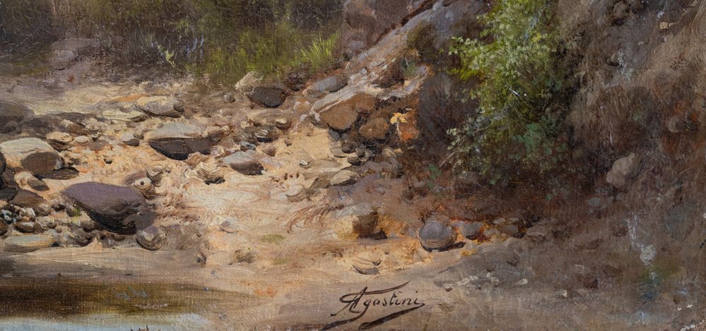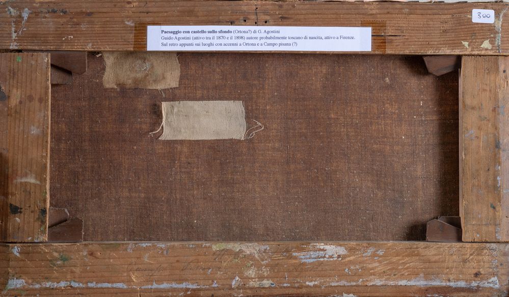 GUIDO AGOSTINI (Firenze - notizie dal 1871 al 1898) "Paesaggio con castello sullo sfondo (Ortona?)". Olio su tela. Cm 21,5x37. Opera firmata in basso a destra Agostini. Al retro reca appunti sui luoghi con accenni a Ortona e Campo Pisana.