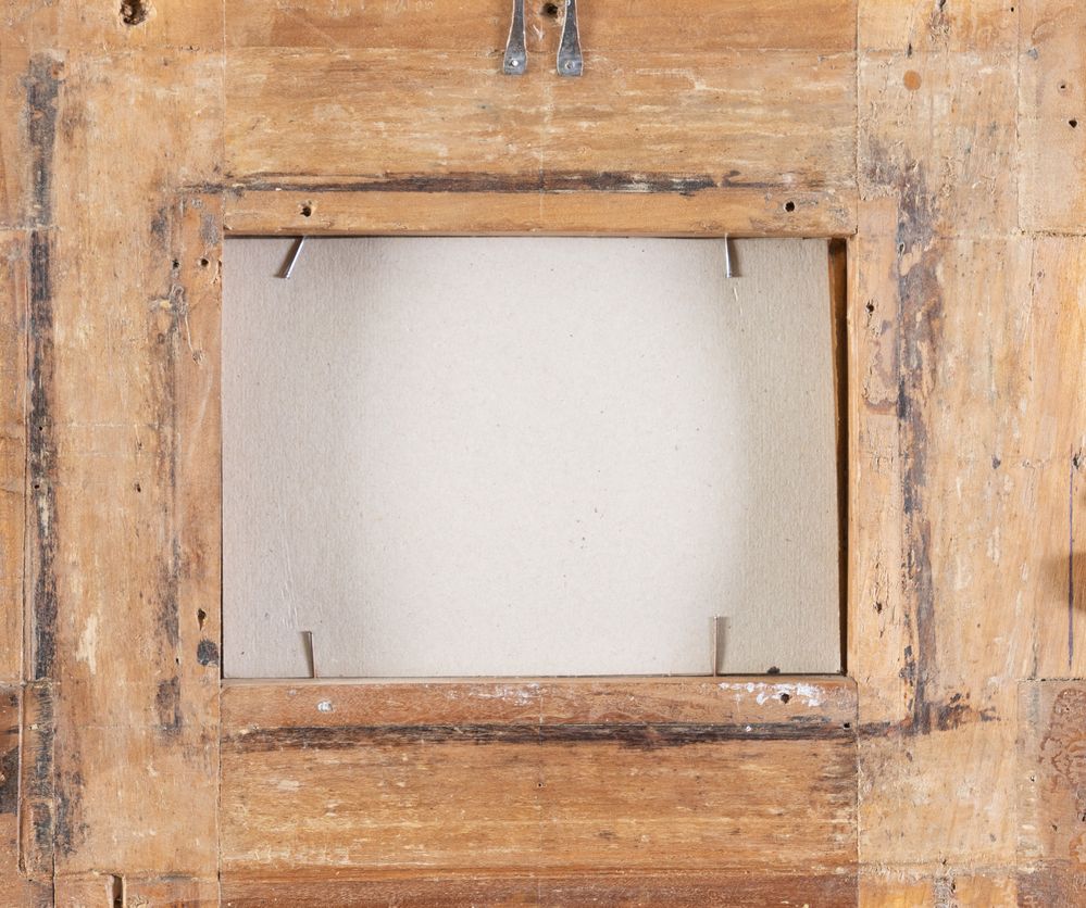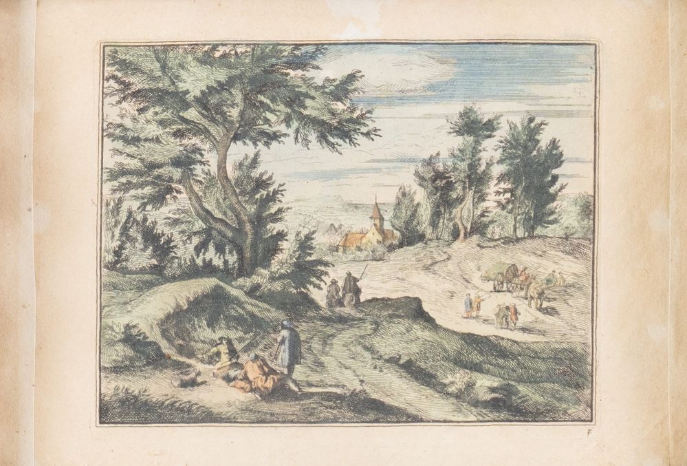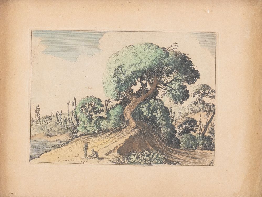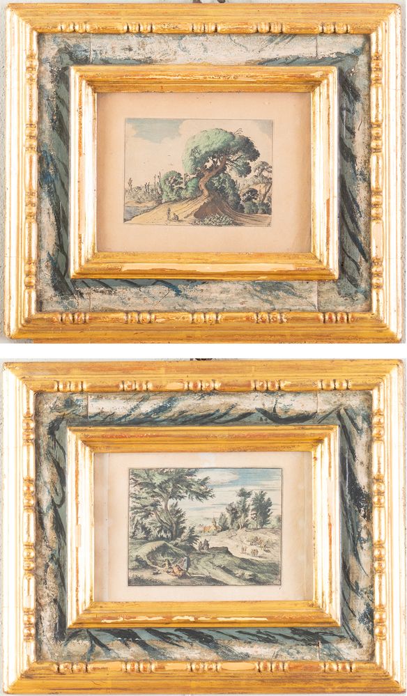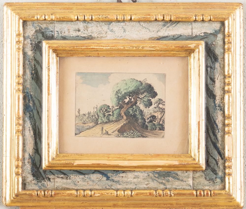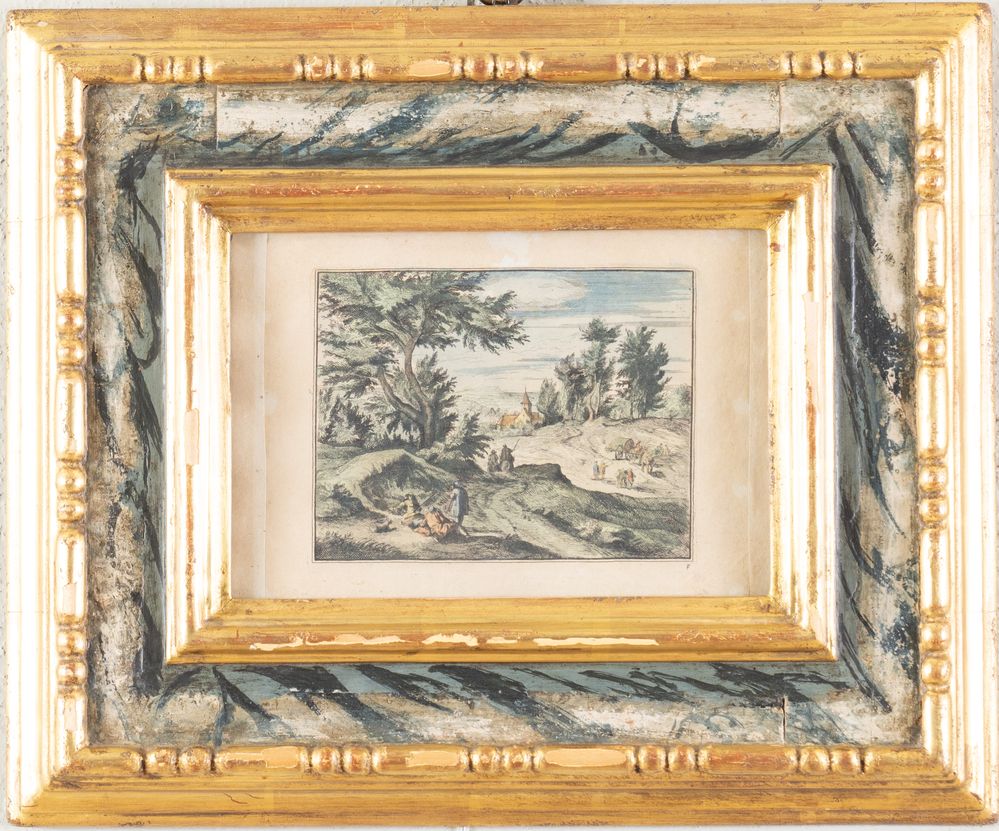 Maestro del XVII secolo. Coppia di incisioni acquerellate raffiguranti paesaggi con figure. Cornici laccate e dorate a cassetta del XVII secolo. Lastra: rispettivamente di cm 10x14 e cm 9,5x13,5.