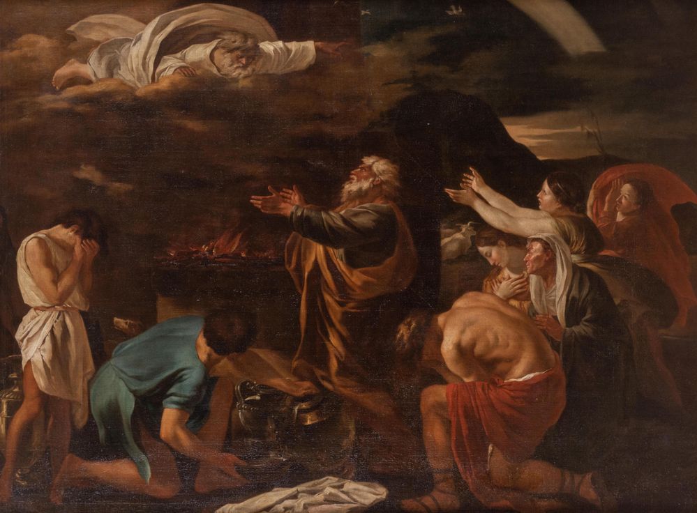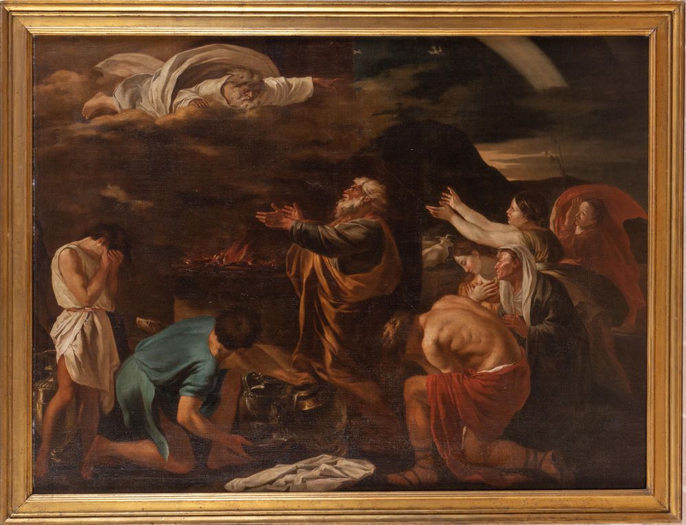 Maestro del XVIII secolo. "Sacrificio di Noè dopo il diluvio". Olio su tela....