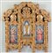 Scuola spagnola del XVII secolo. Altarolo in legno intagliato e dorato con dipinte figure di angeli e calice. Cm 75x76x5.