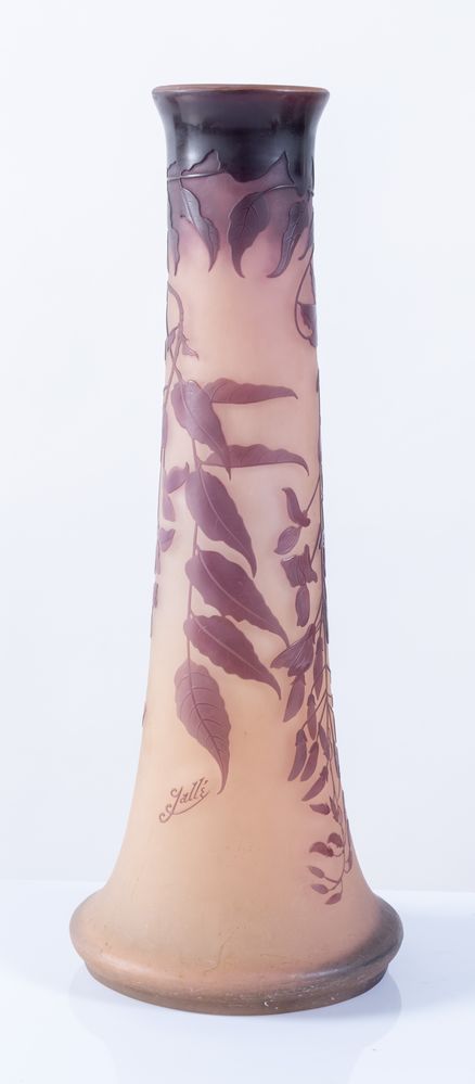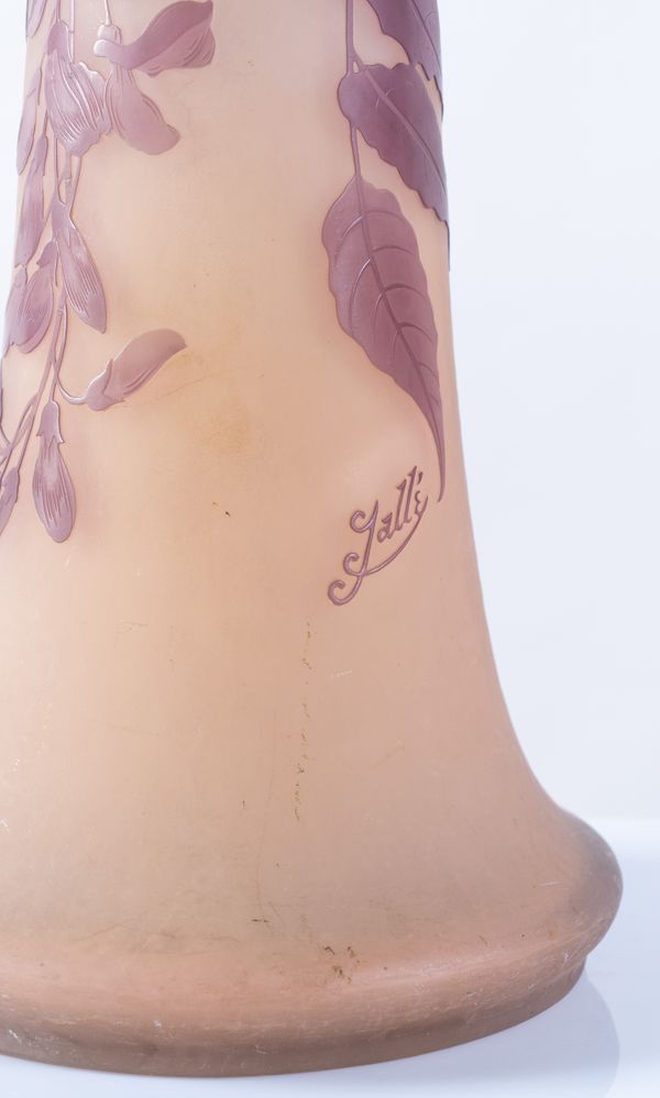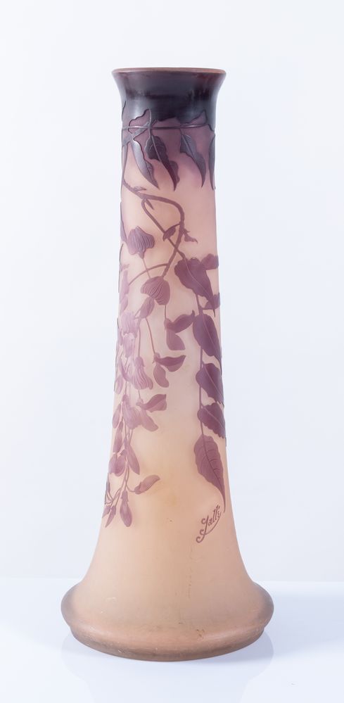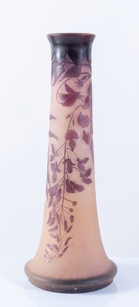 ÉMILE GALLÉ (1846 - 1904), Francia. Vaso in vetro a tromba nei toni del viola, lavorato ad acido, raffigurante fiori di glicine. XIX secolo. Cm 47x ⌀ cm 17. Opera firmata Gallé.