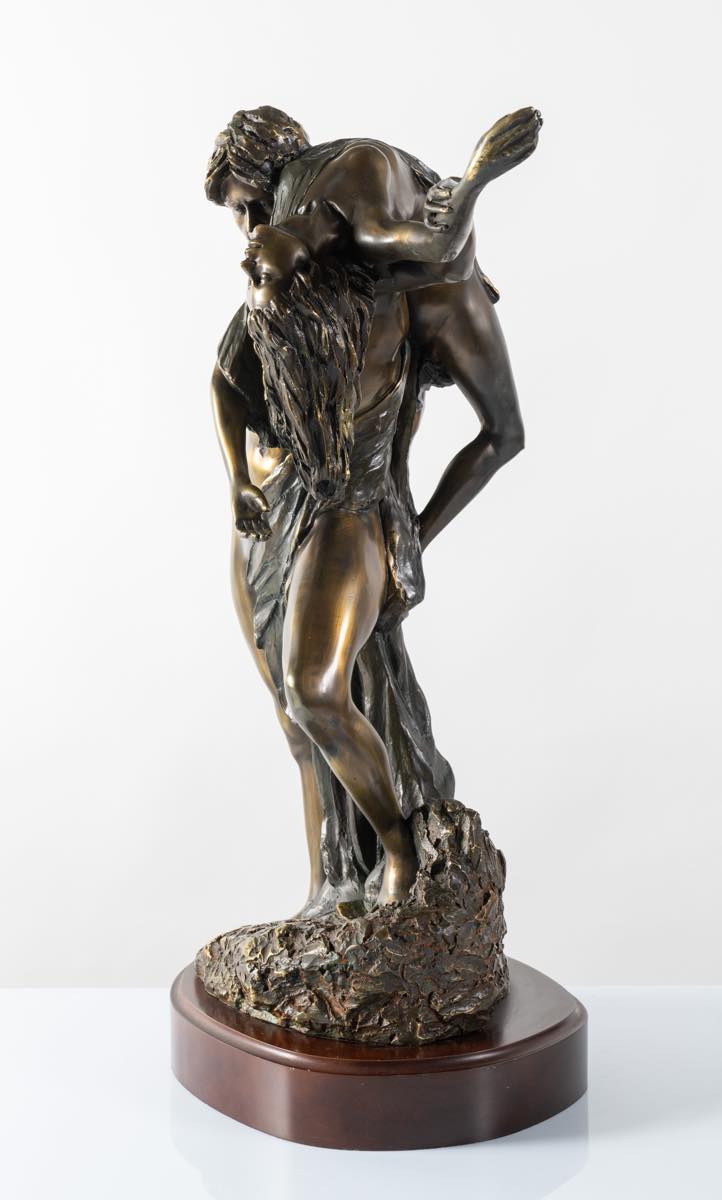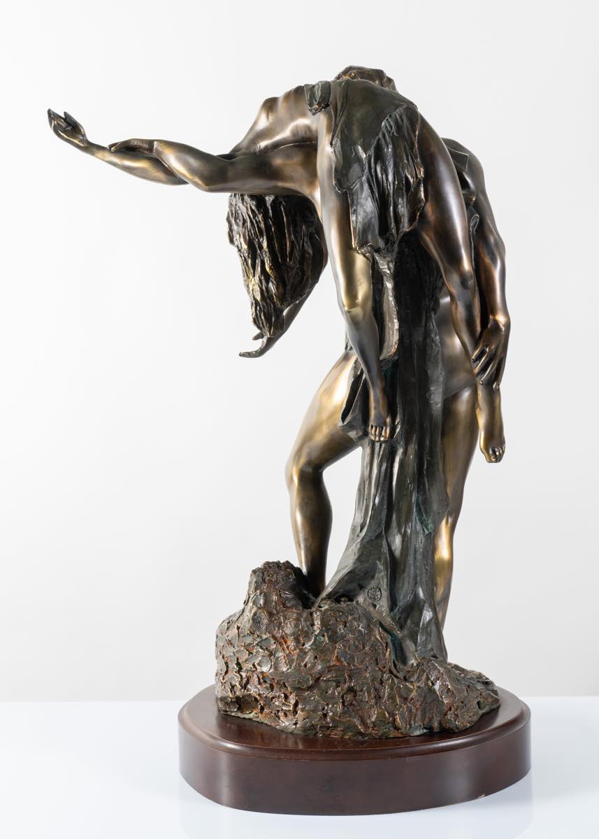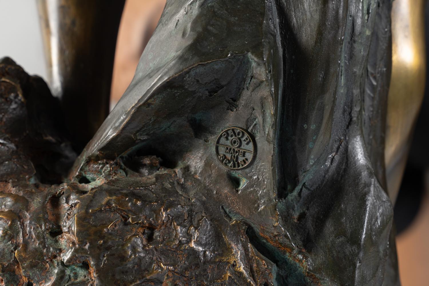 Scultura in bronzo, raffigurante coppia di amanti danzanti. Anni '70 - '80 del XX secolo. Cm 66x56x31. Cm: con base 73x56x31. Reca timbro Paor.
