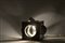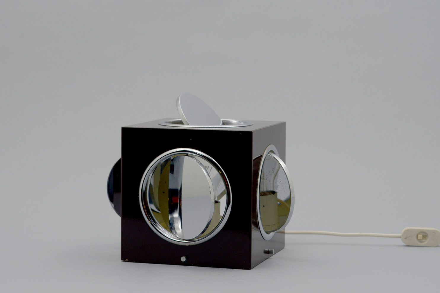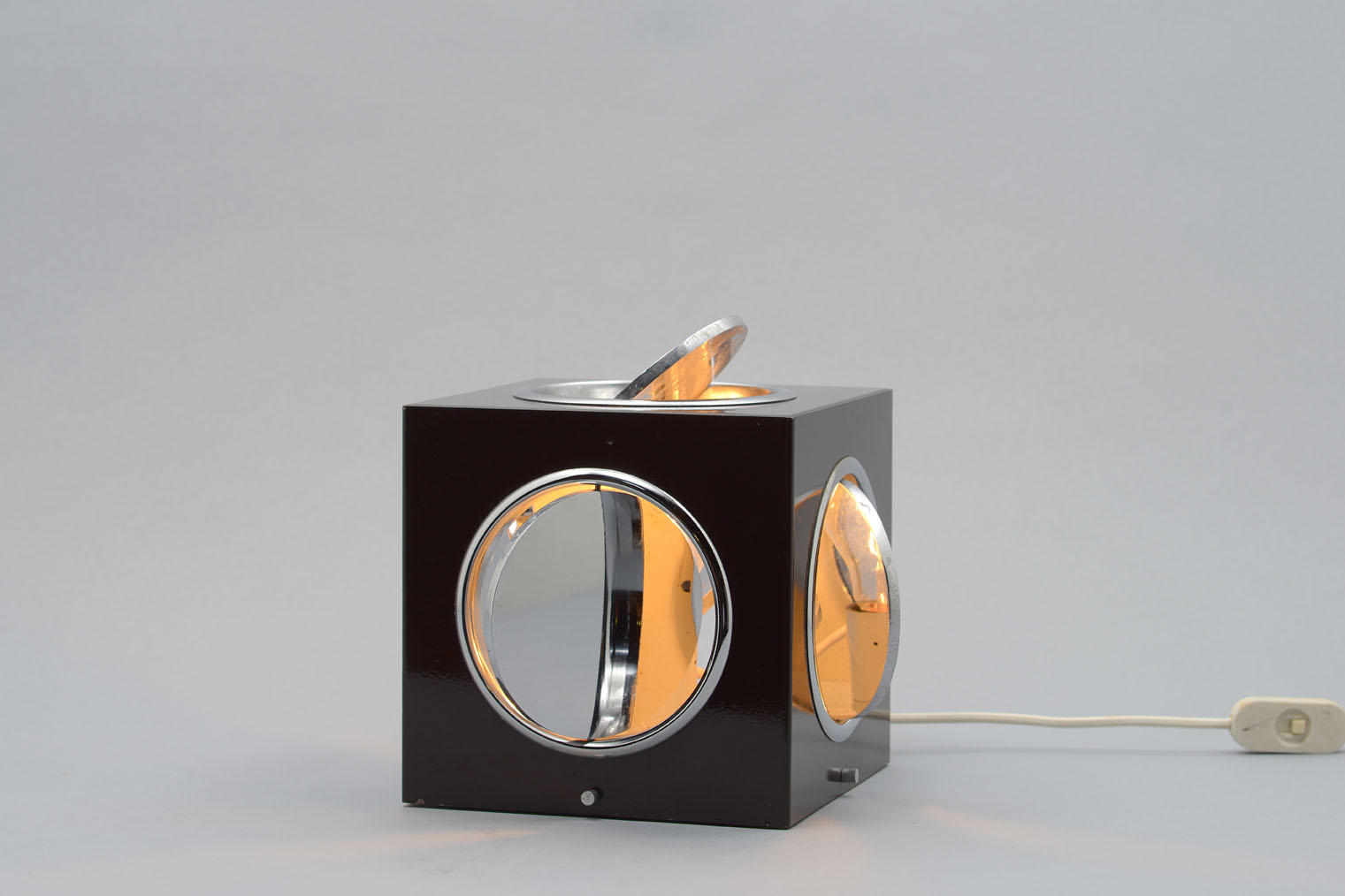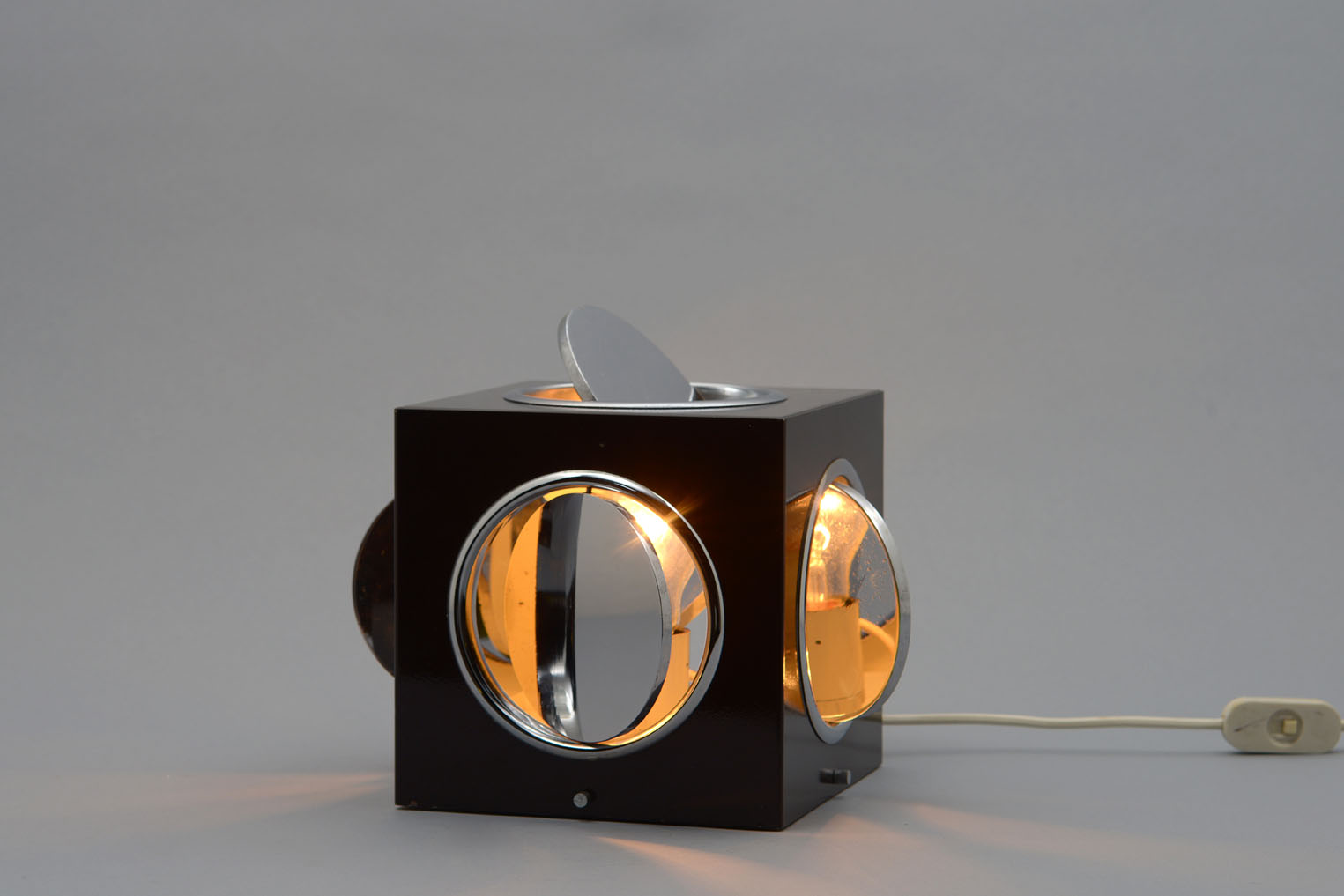 A brown-varnished metal cubical lamp. Five of the sides are open with circular portholes closed by hinged chromed metal circular windows. The portholes can be opened and the light pointed in the desired direction, that comes from a light bulb therein.