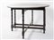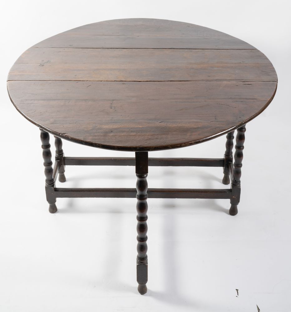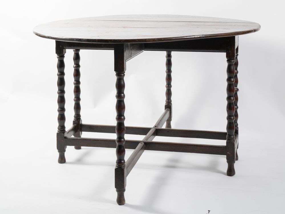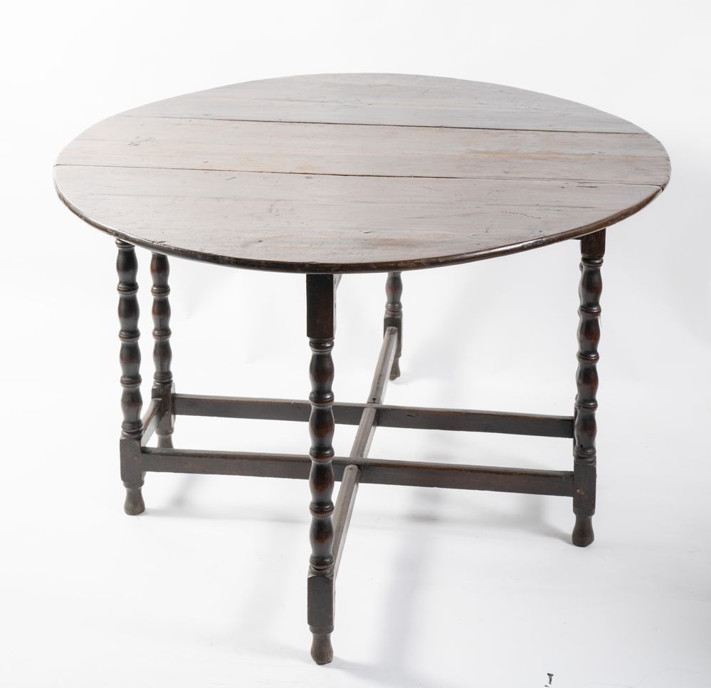 Tavolo ovale a bandelle in legno di rovere, sostegni a balaustra raccordati alla base della traversa. Inizi del XVIII secolo. Bandelle apribili a cancello. Cm 75,8x113,5x53,5 (bandelle aperte). Cm 75,8x79,5x53,5 (bandelle chiuse).