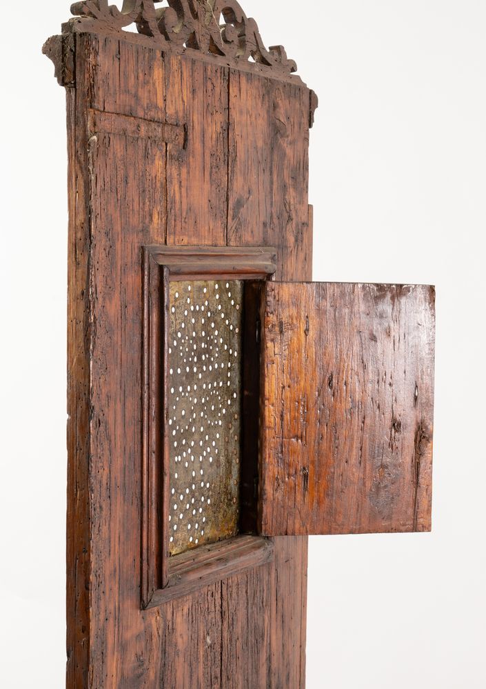 Inginocchiatoio confessionale in legno di pioppo. Emilia, fine del XVII secolo - inizio del XVIII secolo. Cm 173x51x135.