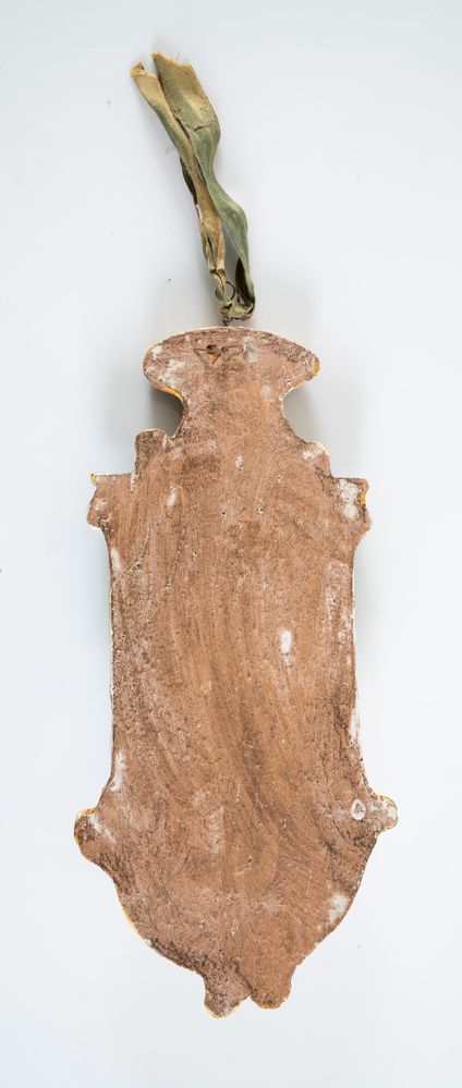 Acquasantiera in maiolica invetriata. Centroitalia, prima metà del XX secolo. Cm 35x16x6.