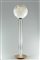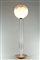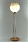 A floor lamp with wooden base and chrome-plated metal stem surrounded by three slender chrome-plated tubes that are joined to the stem with small balls. The transparent glass globe is opalescent in the lower part. Deep grooves and brown stained glass at the tip of the globe. Characteristic Mazzega production.