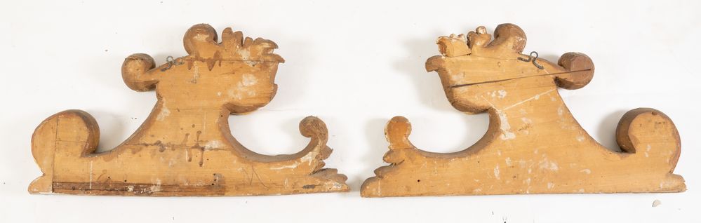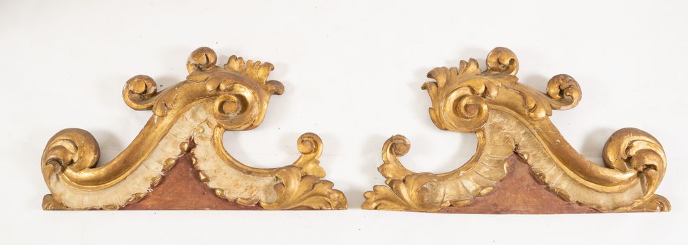 Coppia di fregi in legno intagliato, dorato e laccato. Stato pontificio, XVII secolo. Cadauno di cm 41,5x75,5x6,5.