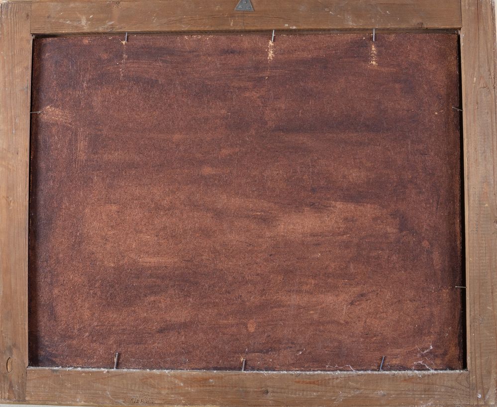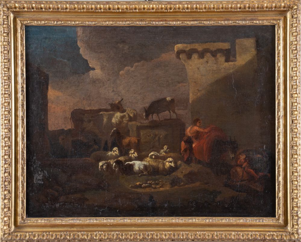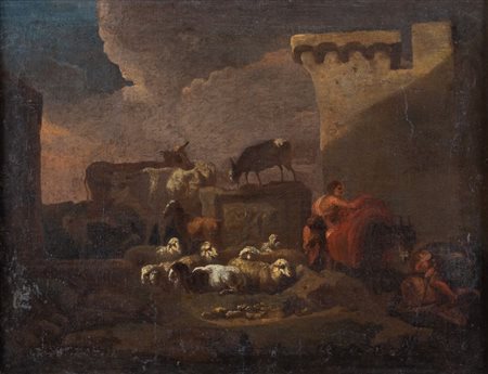 Maestro del XVII secolo. "Scena bucolica". Olio su tavola. Cm 50x65. (restauri)