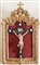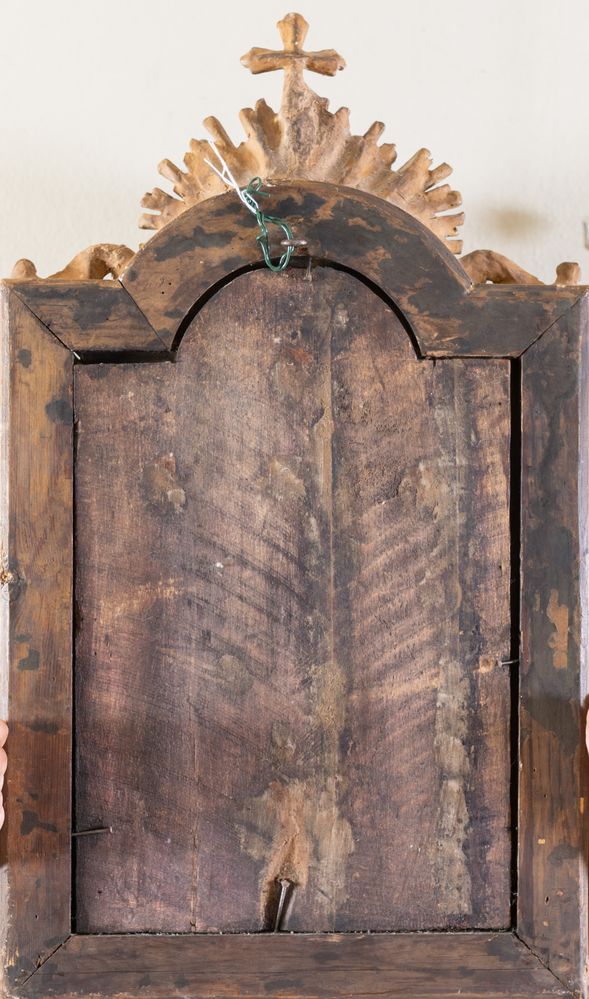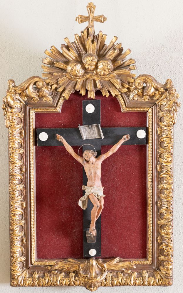 Crocifisso ligneo entro cornice intagliata e dorata di gusto Luigi XV, con al culmine raggiera con tripudio di putti. Metà del XVIII secolo. Cm 64,5x40.