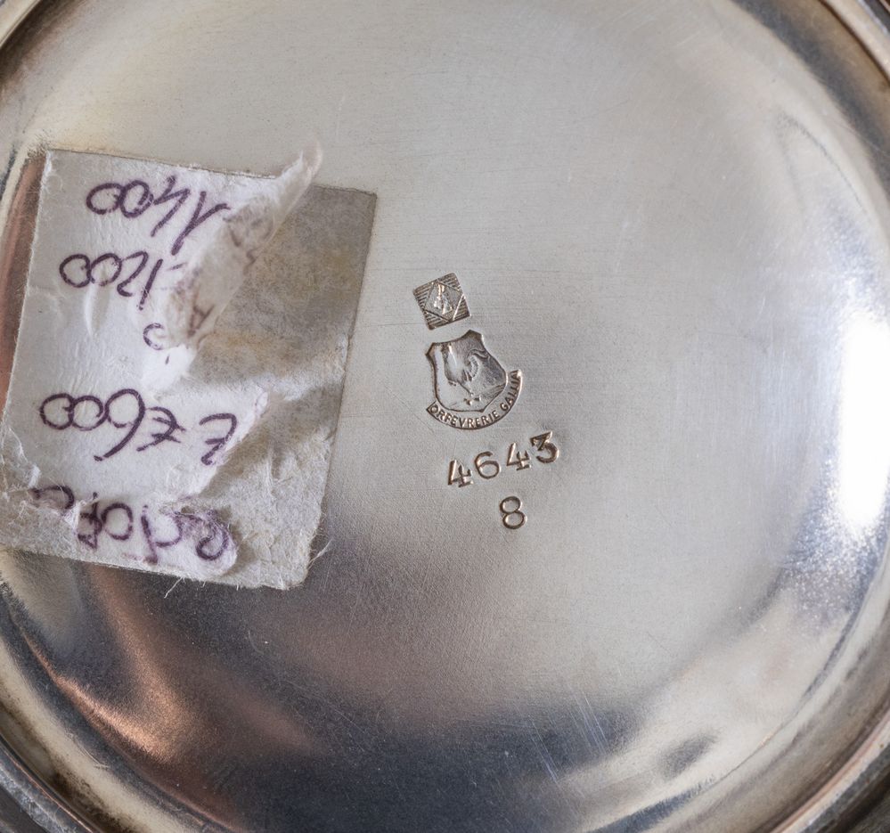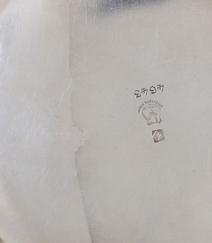 Sotto la base recano punzoni Orfevrerie Gallia, 4643 e 4643 8. Vassoio: cm 28,5x49,5, reca punzone Orfevrerie Gallia, 4591.