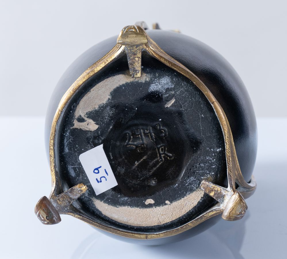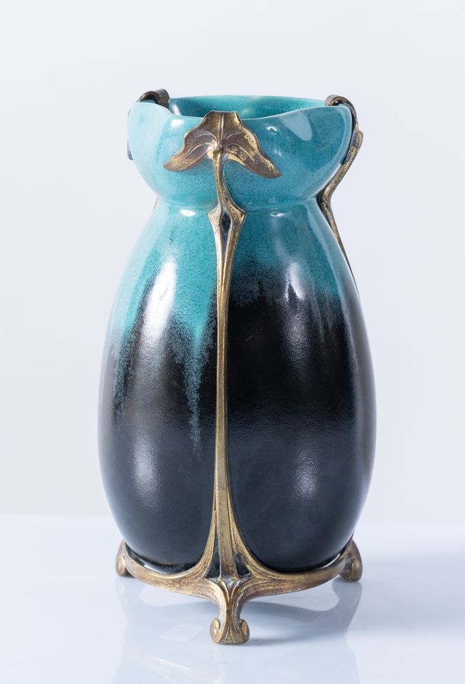 Piccolo vaso Art Nouveau, in maiolica invetriata nei toni del verde e blu scuro, ingabbiata in struttura in bronzo dorato a guisa di edera. Francia, fine del XIX secolo - inizio del XX secolo. Cm 19x10.