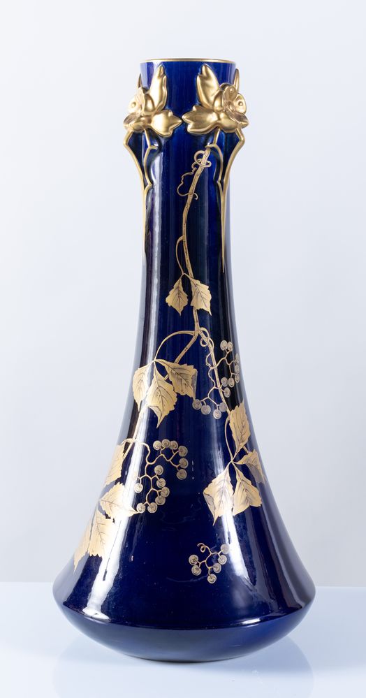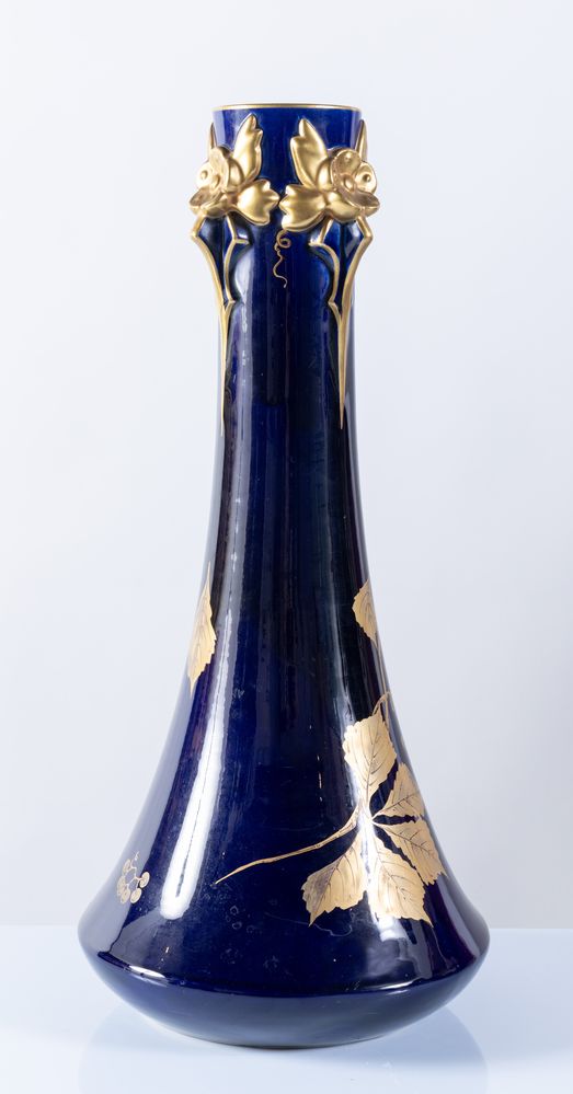 Manifattura di SÈVRES. Vaso in maiolica blu con decorazione a guisa di vite e uva e pampini in oro. Cm 51x23. Marcato sotto la base. Fine del XIX secolo.