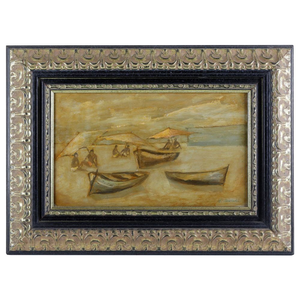 Spiaggia con bagnanti seconda metà XX secolo dipinto ad olio su tavola 15,5 x 27 cm