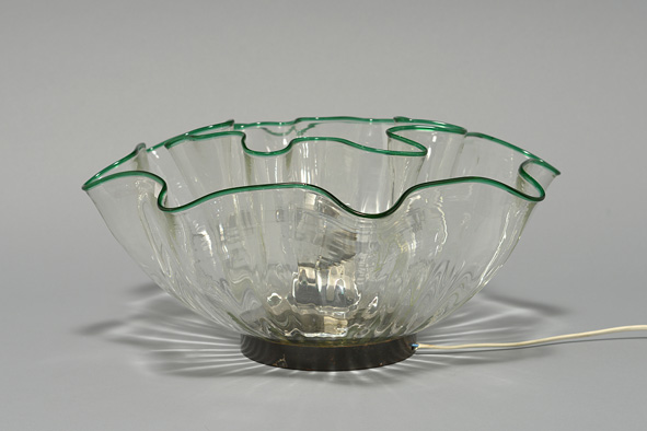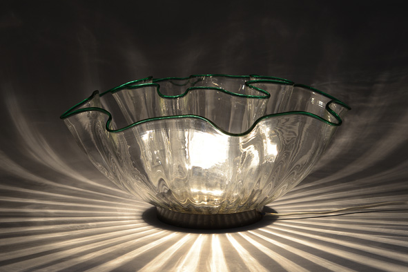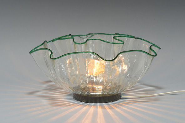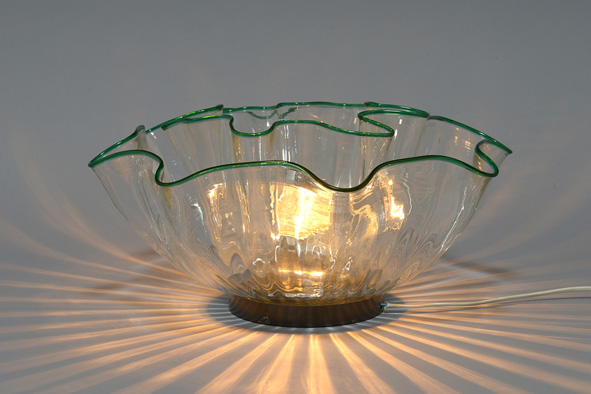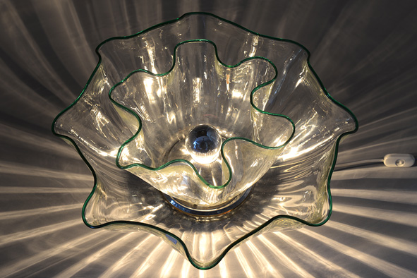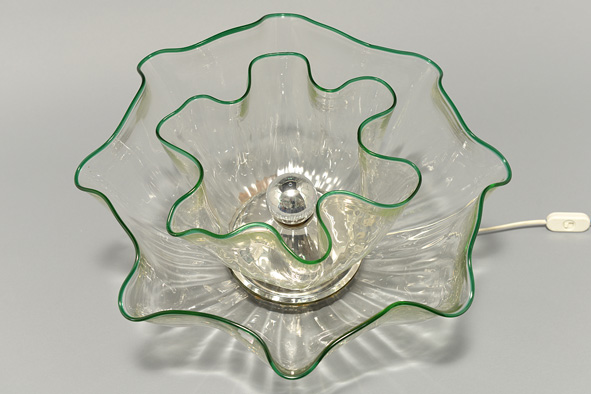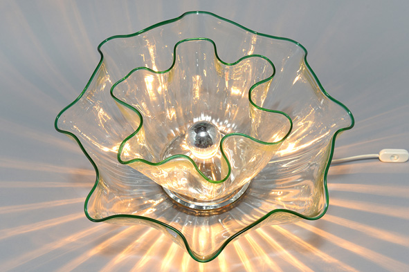 A lamp composed of two superimposed blown glass leaves, with a bright green edge. E27 bulb base with a silver-plated topped surface light bulb of max 150W.