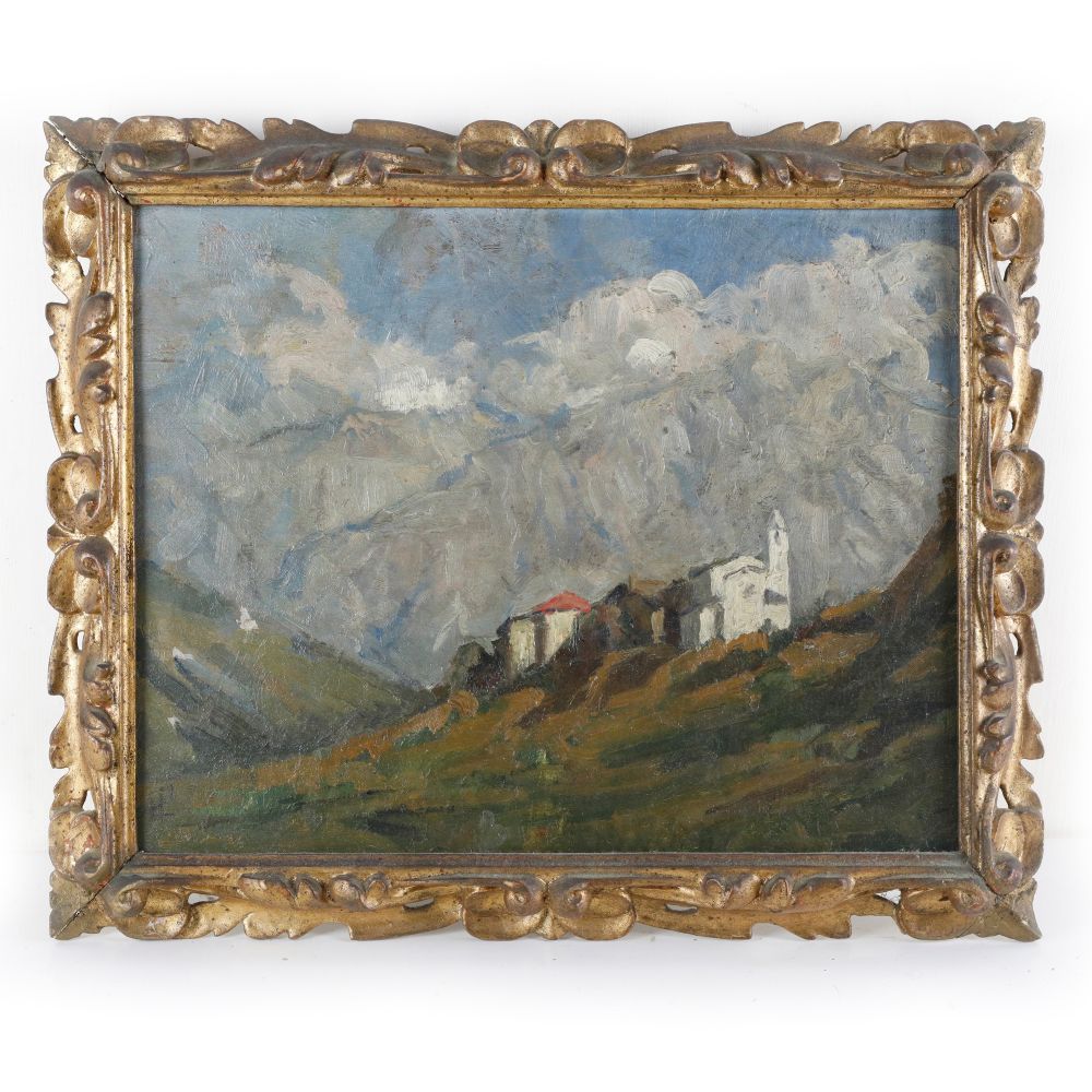 Scorcio di montagna con paese prima metà XX secolo dipinto ad olio su tavola 24 x 30 cm