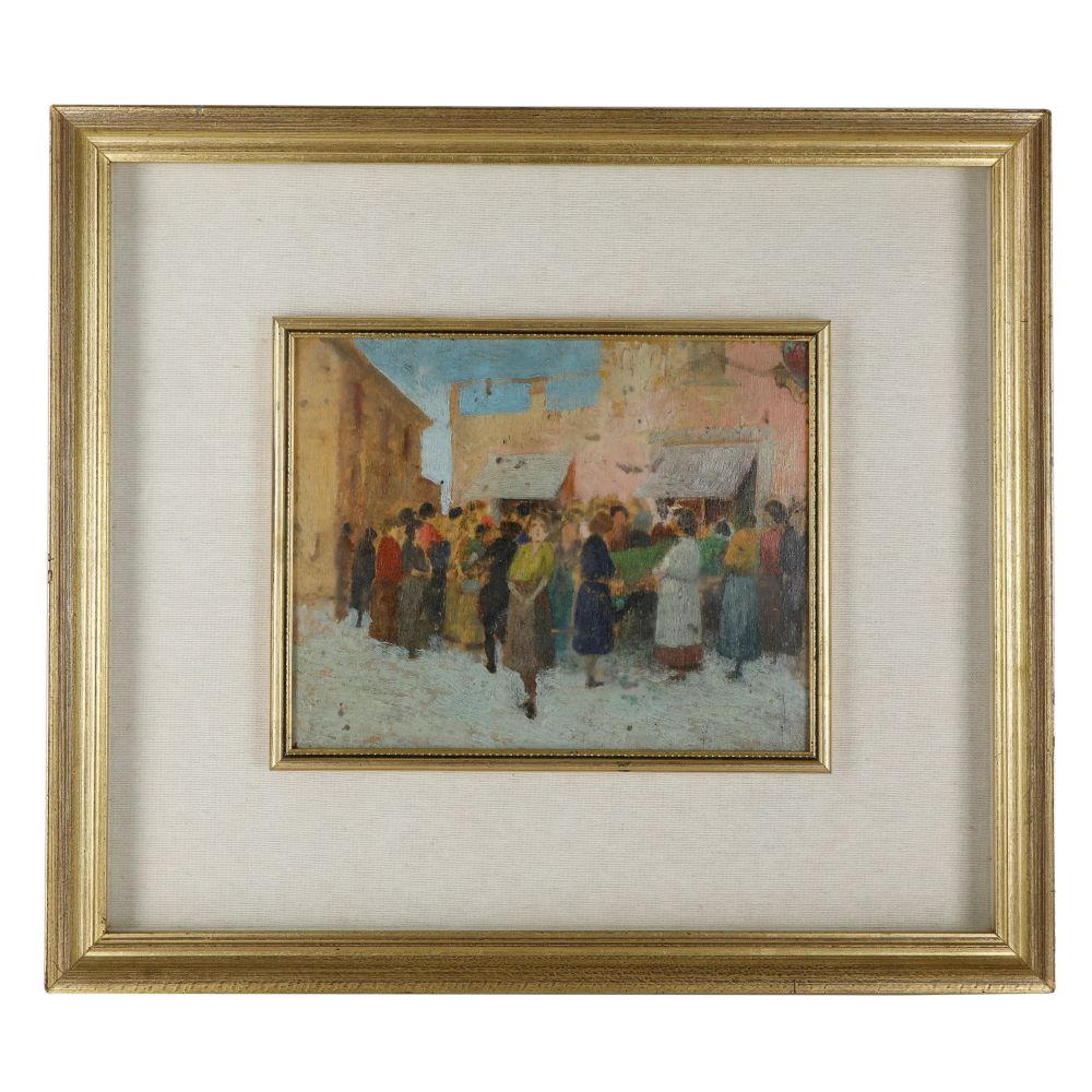 Popolane al mercato, coppia dipinti ad olio su tavola inizi XX secolo 20 x 25 e 17 x 23 cm