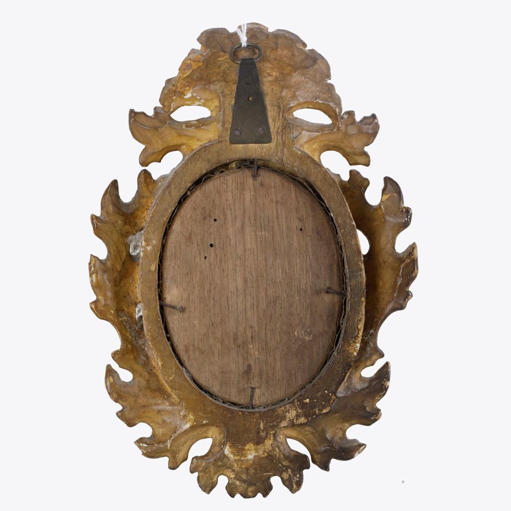 dipinto ad olio su tela 13 x 10 cm ad assetto ovale entro cornice linea dorata scolpita a motivi vegetali. Piccole mancanze alla cornice