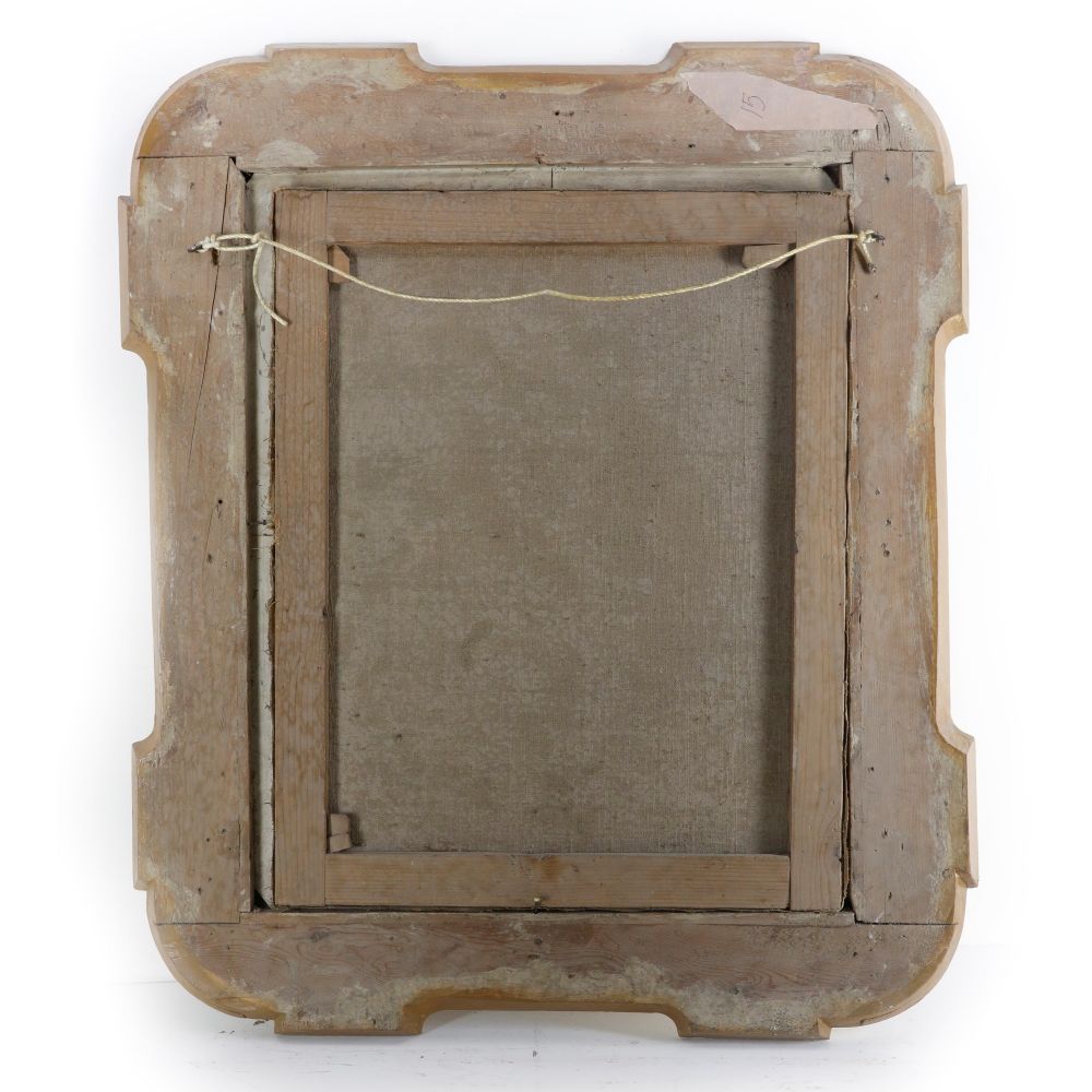 dipinto ad olio su tela entro cornice a foglia d'oro puntinata.