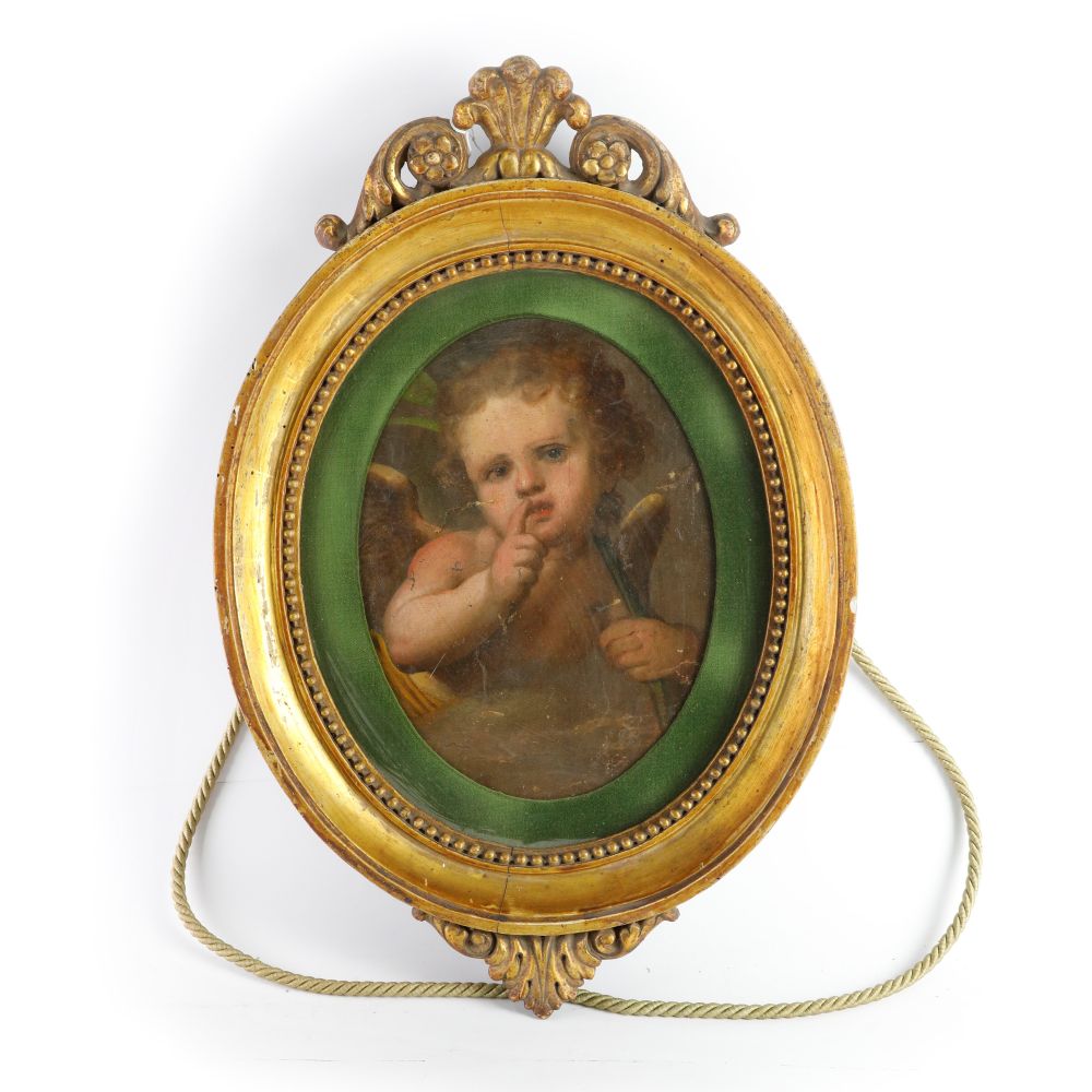 Putto alato ad assetto ovale inizi XIX secolo dipinto ad olio su tela 30 x 22 cm