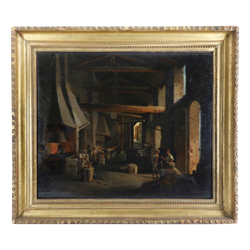 Interno di fucina XIX secolo dipinto ad olio su tela 55 x 67