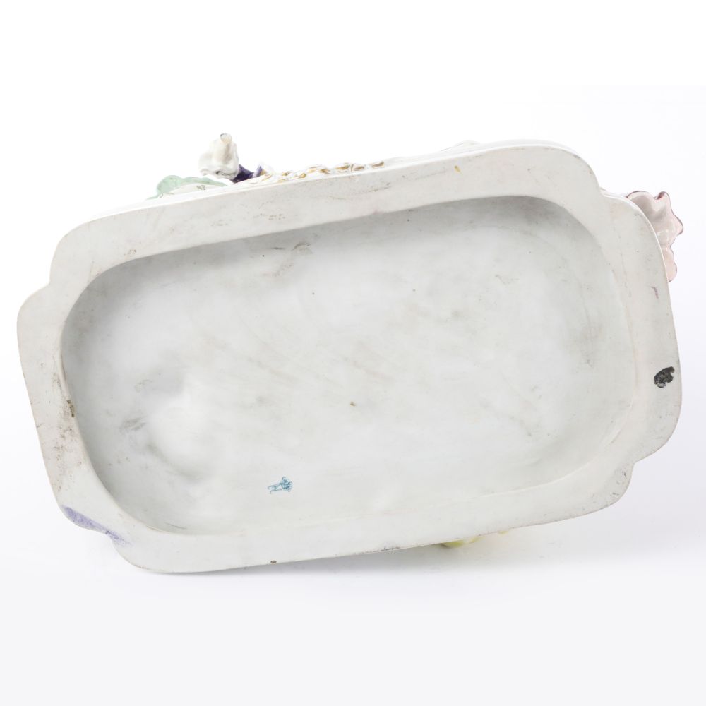19 x 25 x 15,5 cm in policromia e base bianca con decoro di fiori in rilievo e decoro in oro zecchino, difetti e mancanze, Marca "n" coronata in blue sotto la base