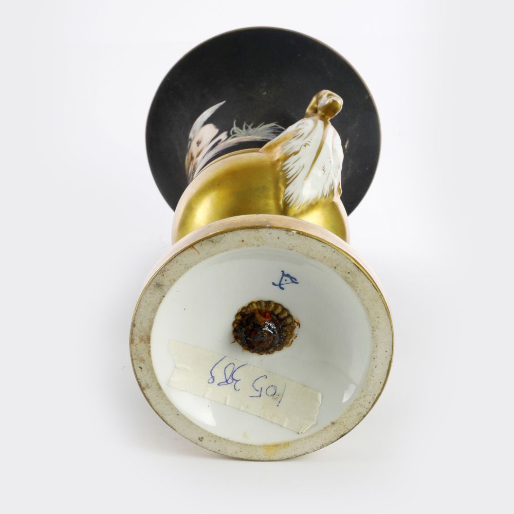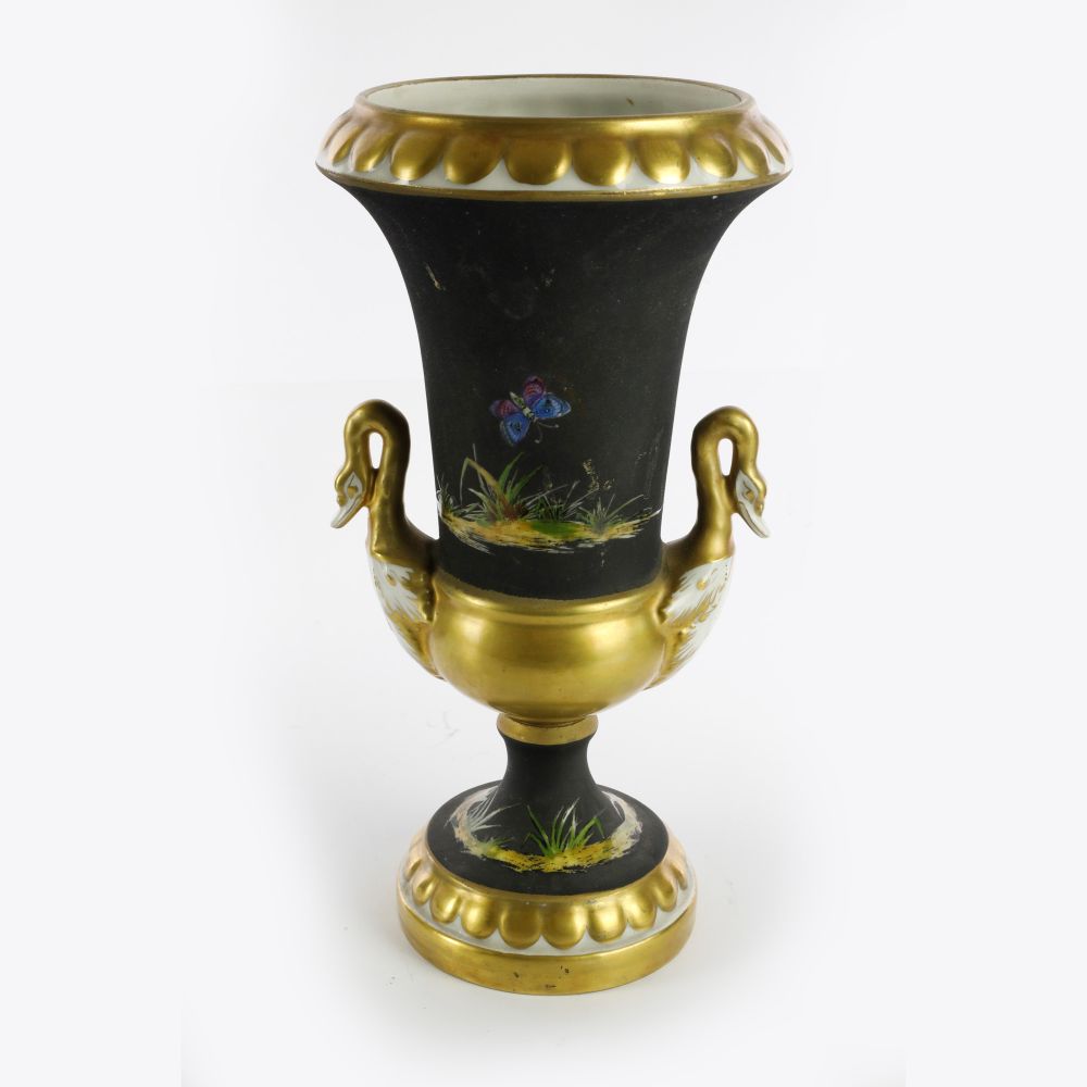 29 x 10,5 cm a 2 corpi a forma di calice con anse a forma di cigno e orlo superiore ed inferiore alla base ad ovuli. Decoro con angelo alato farfalle e verdura in policromia su fondo nero finiture in oro zecchino. Manifattura francese con marchio in blu sottosmalto alla base.
