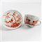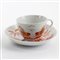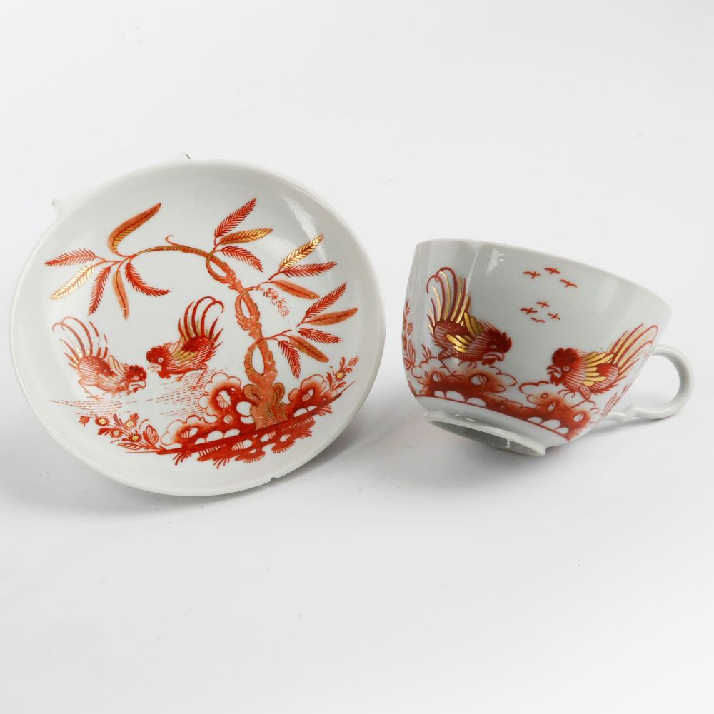 5 x 3,4 alla base 12, 5 x 2,4 cm in pasta bianca con decoro a coda di gallo in porpora e oro. Piccole sbeccature e mancanze lungo il bordo della tazza e del piatto. Manifattura Ginori