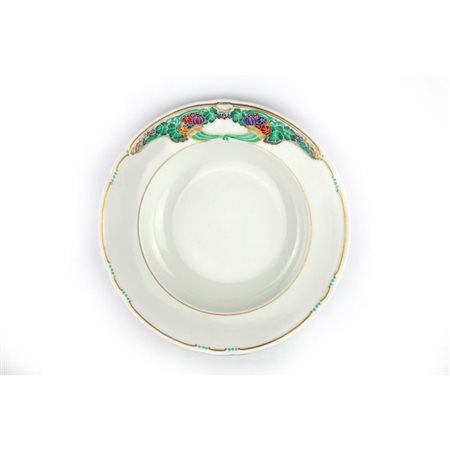 25 x 4 cm facente parte del servizio Ceres con decoro in rilievo sulla tesa a frutti e foglie e finiture in oro zecchino. Servizio realizzato per i 50 anni della manifattura imperiale di Berlino KPM su disegno di Theo Schmuz - Baudib