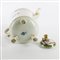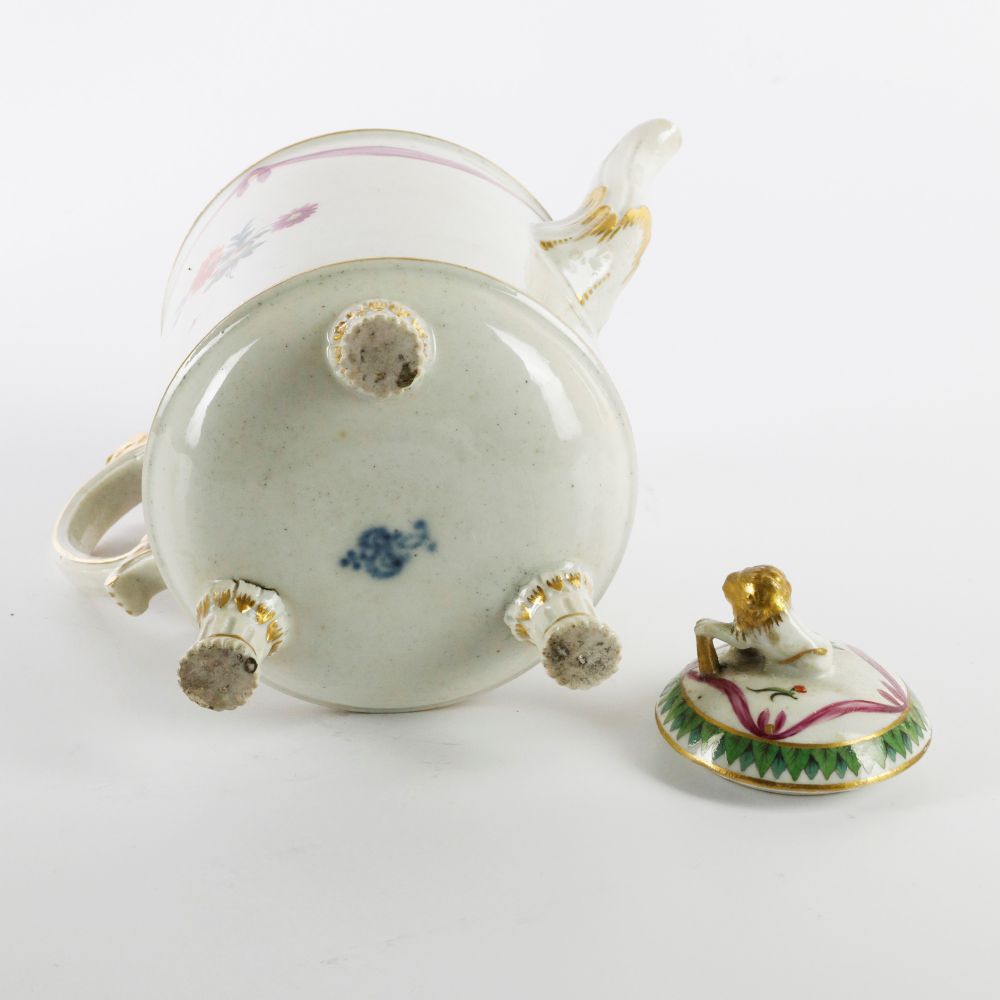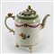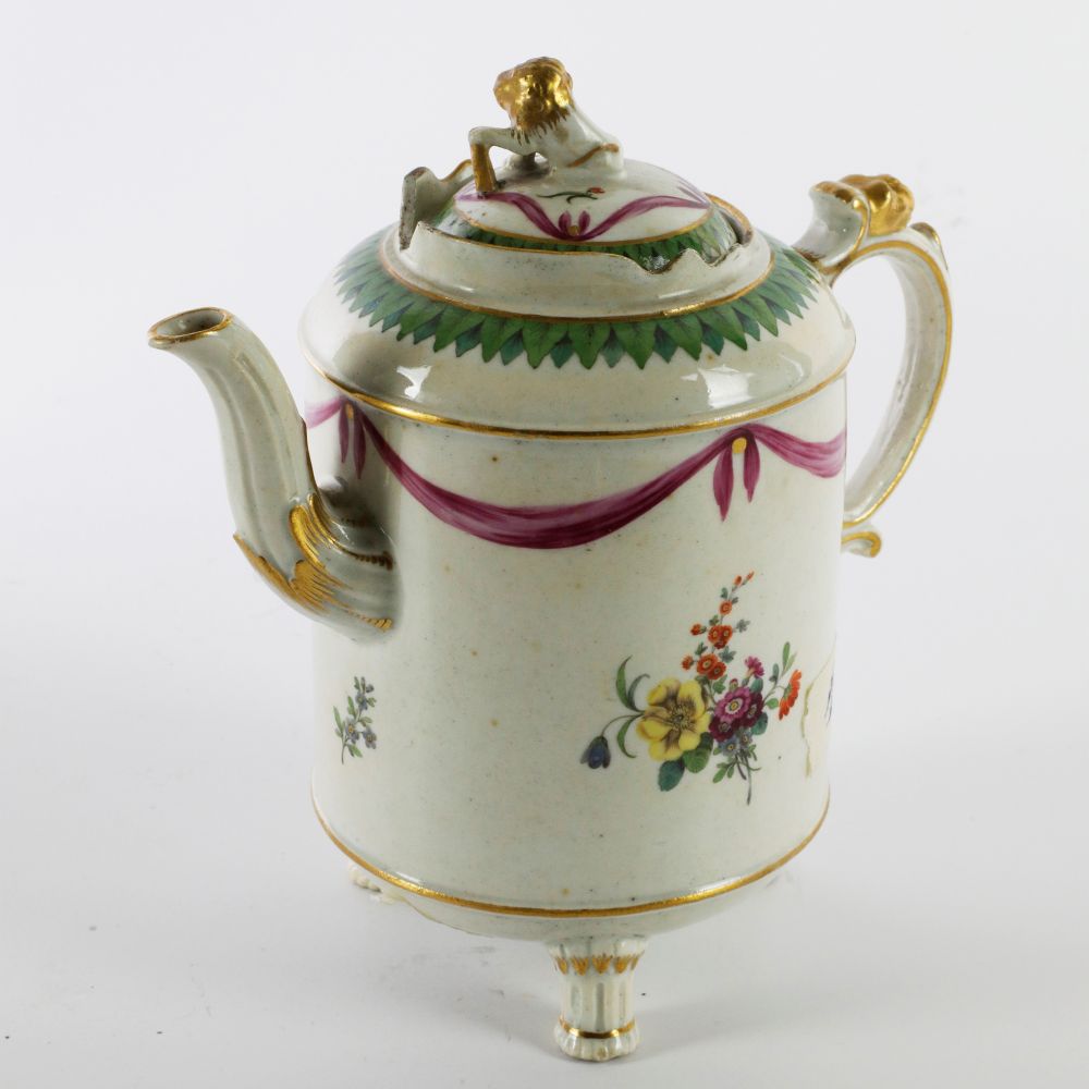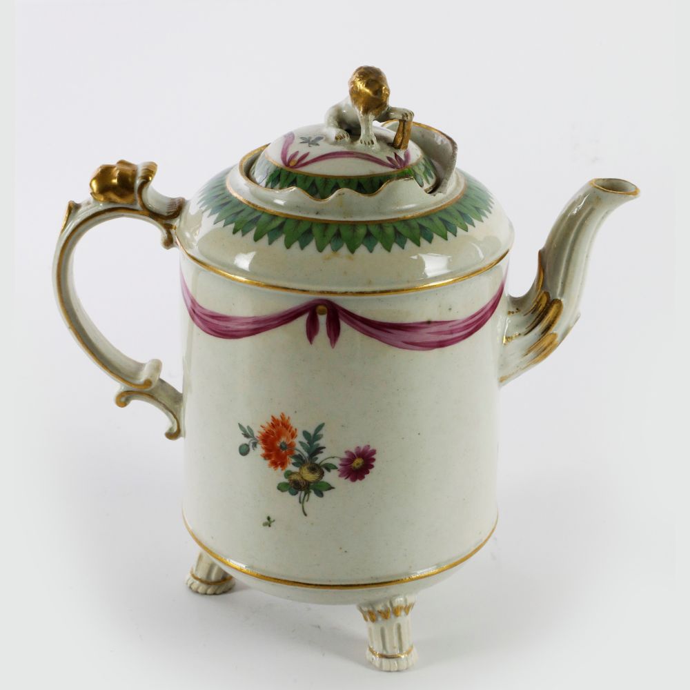 18 x 17 x 10 cm di forma cilindrica con 3 piedi d'appoggio a tronco di colonna, ansa a doppia virgola con protone leonina, versatoio a becco e impugnatura del coperchio a forma di leone. Di fondo bianco con decoro floreale sul corpo delimitato da festoni color porpora nella parte superiore. Decoro a foglie nella parte apicale della caffettiera. Mancanze nell'orlo superiore nella caffettiera . Marcato in blu sottosmalto alla base, manifattura di Ludwingsburg