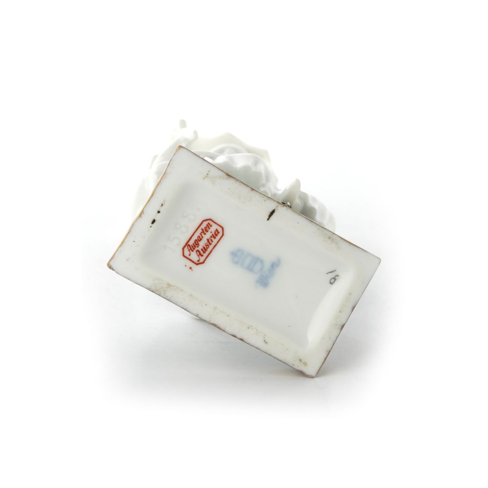 12 x 5,5 x 3,2 cm su base policroma. Su disegno Herta Bucher, manifattura Augarten Vienna. Marchi di fabbrica in blue e rosso sottosmalto, numero dell'autore e del decoratore incusso nella pasta e in oro.