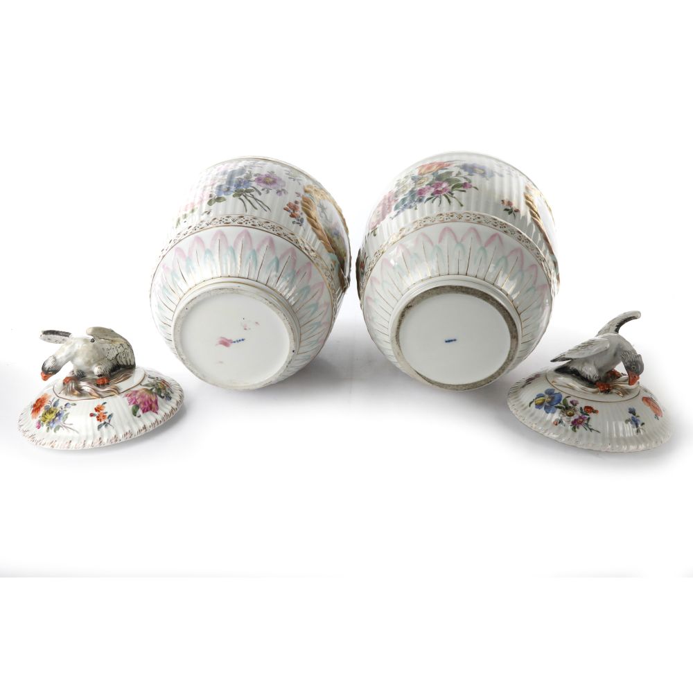 40 x 11,5 cm coperchio con impugnatura a scultura di rapace. Corpo ovoidale con cinture apicale orizzontale a motivi a greca e cintura basale con elementi floreali a rilievo .Poggiante su base ad anello .Coperchio e corpo del vaso a scanalature verticali con coppia di riserve entro decorazione floreale con scene cortesi entro le riserve , finiture in oro zecchino. Manifattura imperiale di Berlino (ala rincollata)