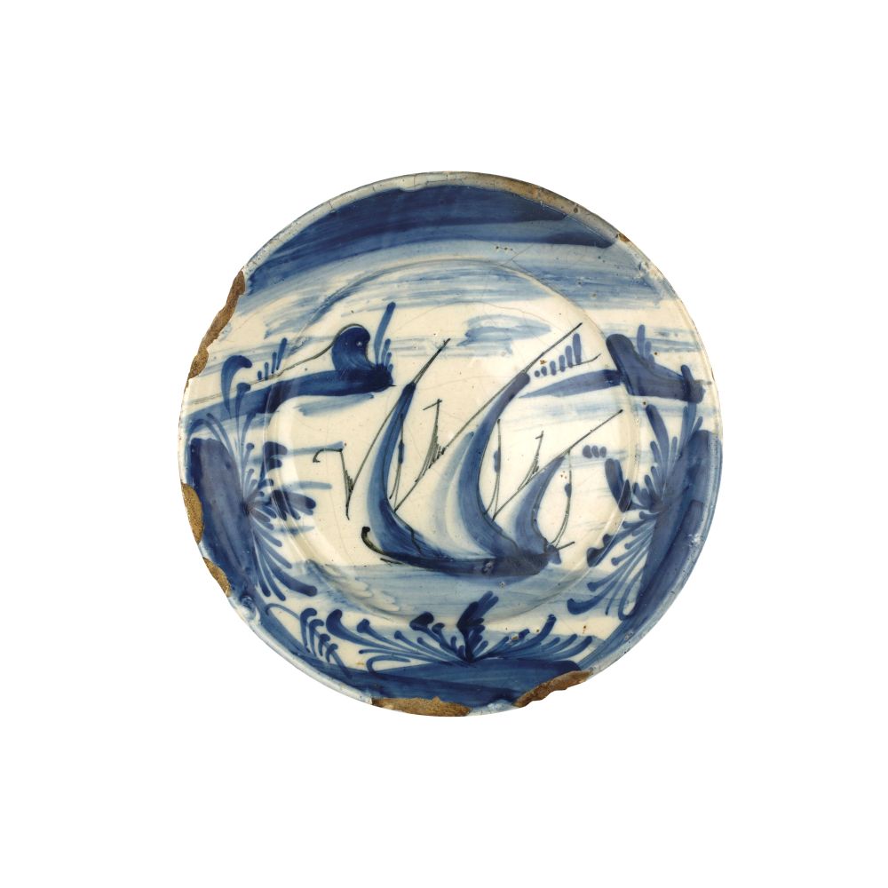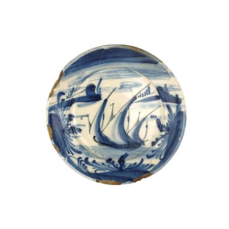 diametro 27,5 cm fondo ad anello con paesaggio marino e barca. Al retro in blu sottosmalto marca della manifattura , Spagna Talavera della Reina. Cadute di smalto e di colore lungo l'orlo del piatto