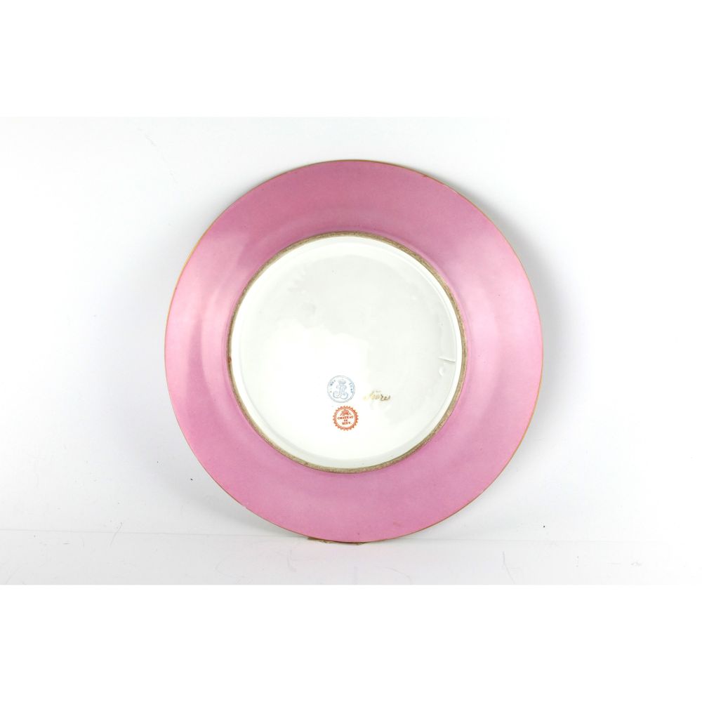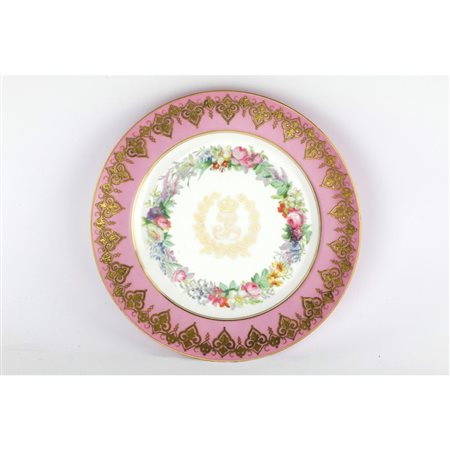24 x 3,2 x 14 cm a fondo ribassato. Tesa di colore rosa con decoro geometrico stilizzato in oro zecchino. Fondo del piatto con corona di fiori alla base della balsa e monogramma di re Luigi Filippo al centro del fondo entro ghirlanda in grisaglia. Manifattura reale di Sevres con marchi di fabbrica e data in blu e rosso sottosmalto