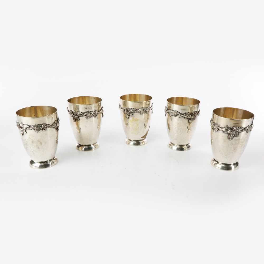 Lotto di 5 bicchieri in argento martellato 800/1000 seconda metà XX secolo