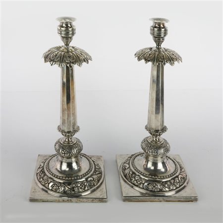 Coppia di candelieri in argento 800/1000 punzoni Torino, prima metà XIX secolo