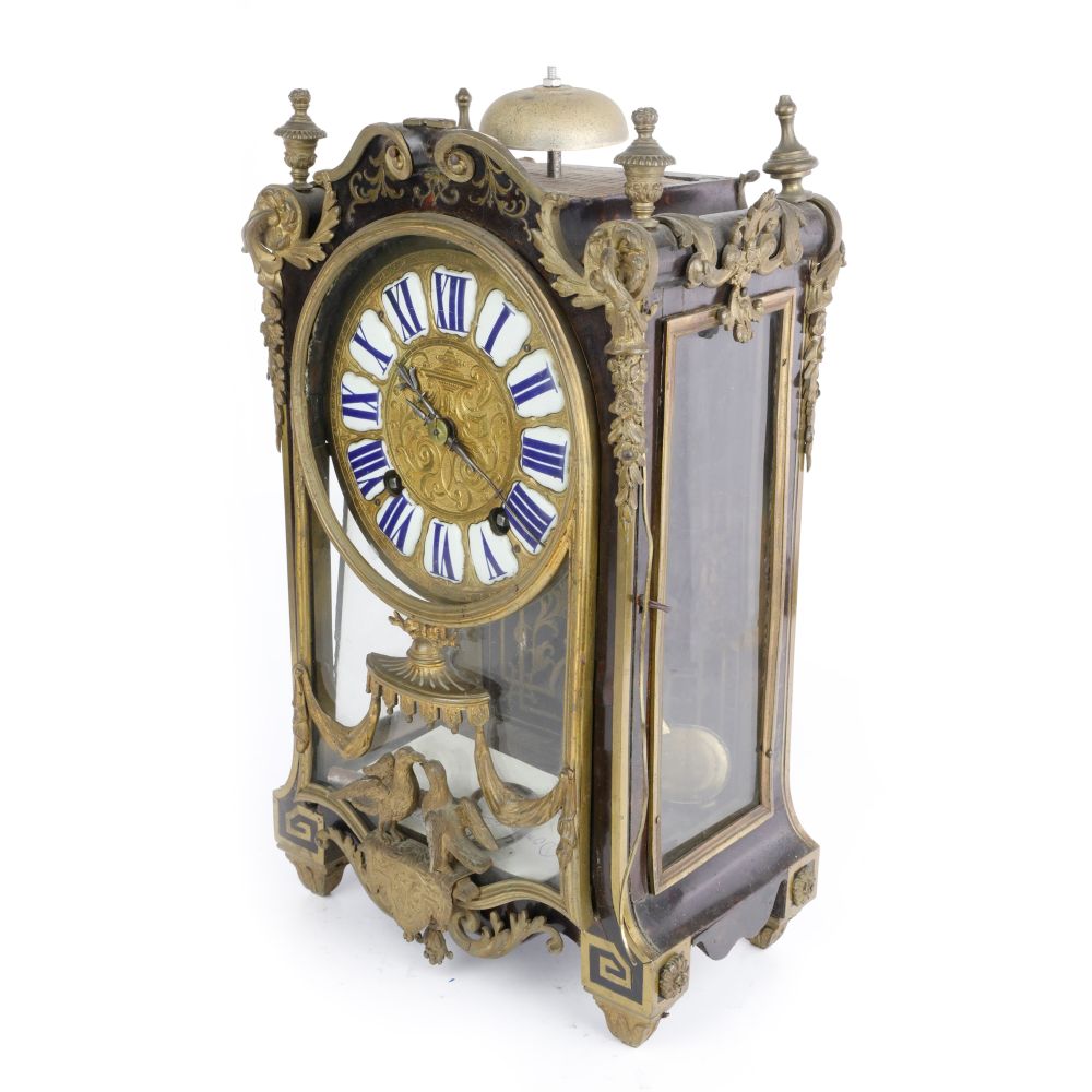 35 x 22 x 12 cm meccanismo a pendolo entro cassa in legno ebanizzato con finiture in bronzo, quadrante in bronzo con numeri romani smaltati, piccole mancanze