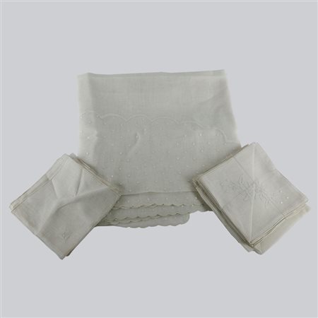 Tovaglia in lino bianco con ricamo floreale e pallini Italia seconda metà XX secolo