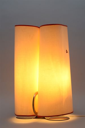 A lamp made up of two diffusers in plasticized fabric with red edging, held in shape by two rods joined to the internal brass and aluminium structure. Two E27 light fittings, marked Flos.