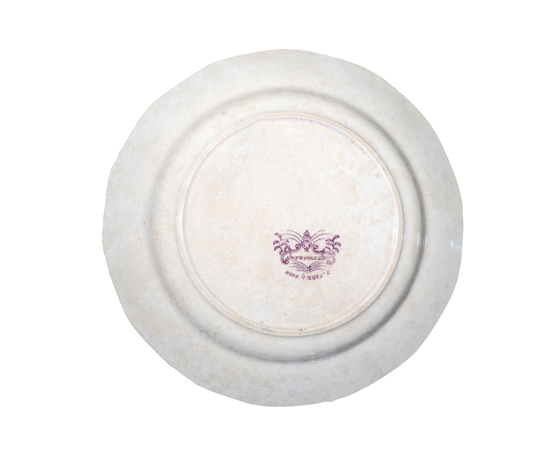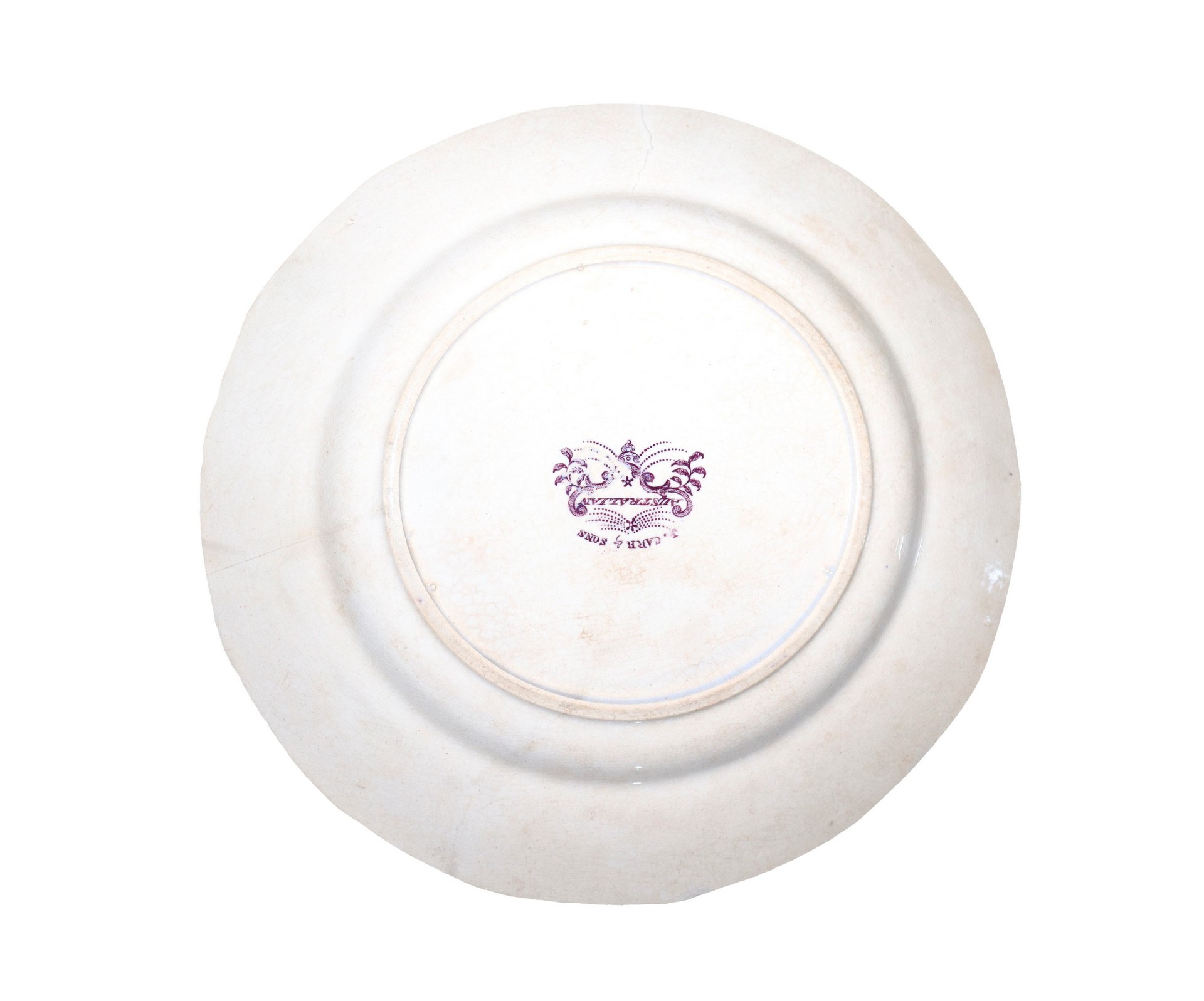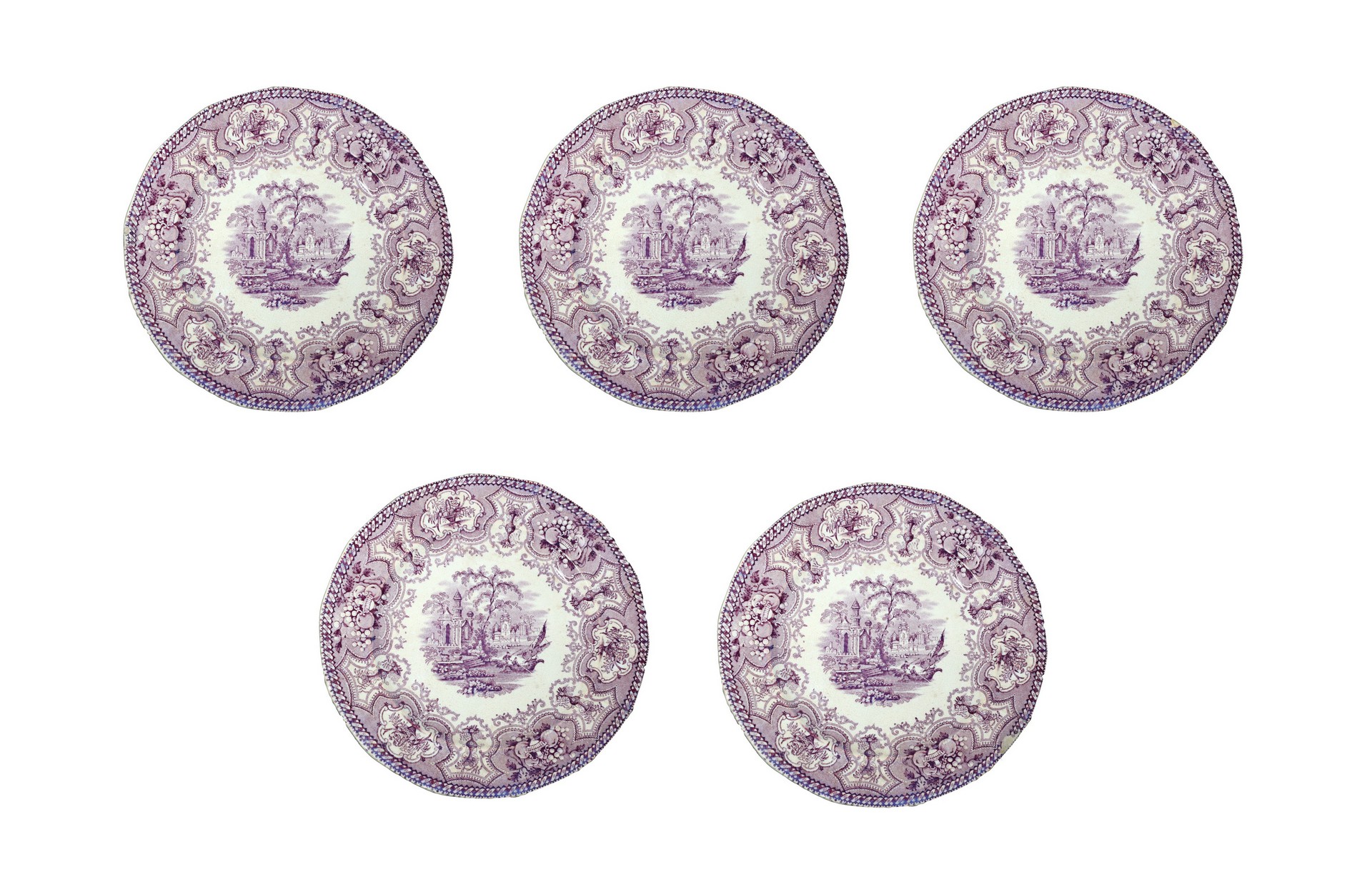 Gruppo composto da N.5 piatti da muro, Primi del 20° secolo Diametro cm 24 Con decorazione centrale di paesaggi e motici floreali a giro. Marchio J.Carr & Sons, Australian. Piccoli difettiCon decorazione centrale di paesaggi e motici floreali a giro. Marchio J.Carr & Sons, Australian. Piccoli difetti