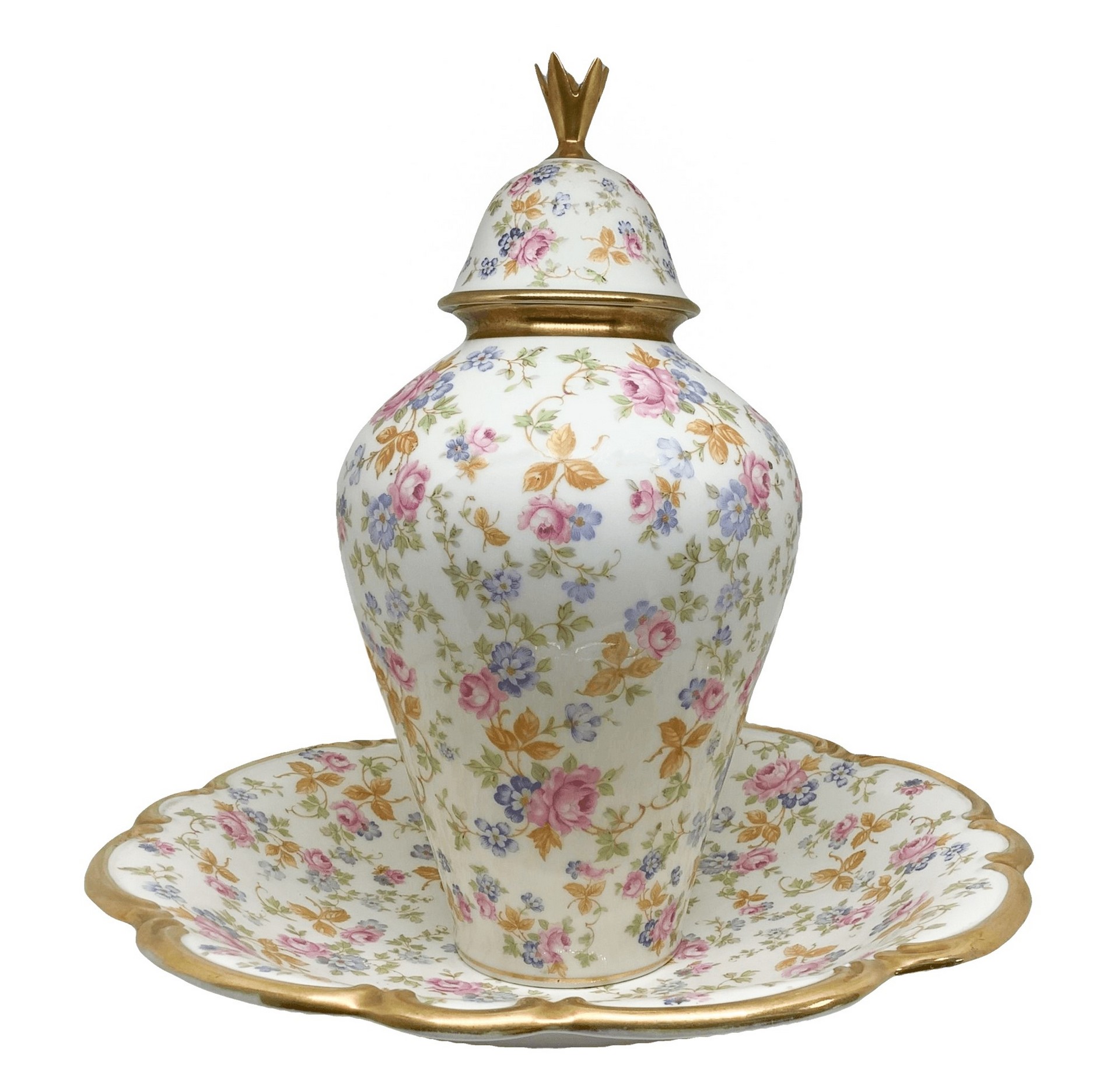 Poutiche con sottopiatto in porcellana Lindner Bavaria, 20° secolo h complessiva 35 cm con decorazioni floreali. Marchio alla base. Piccola mancanza all'impugnatura del coperchio.con decorazioni floreali. Marchio alla base. Piccola mancanza all'impugnatura del coperchio.