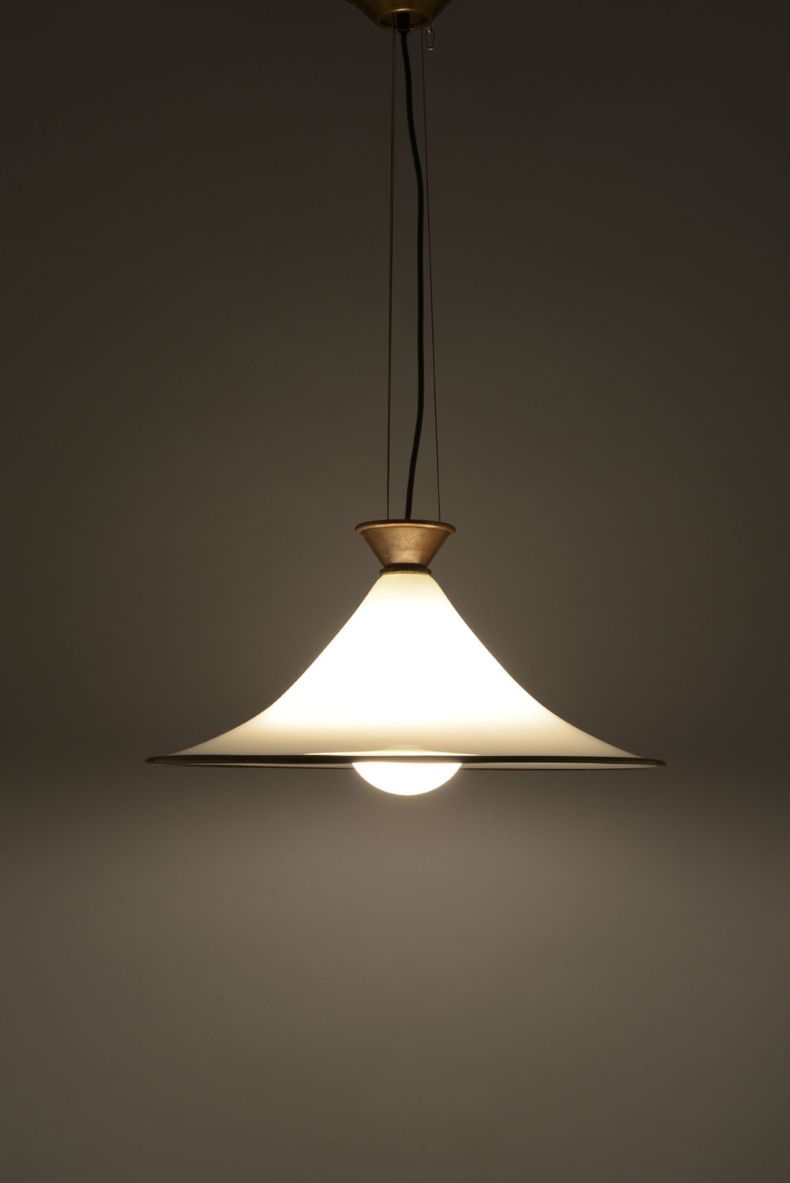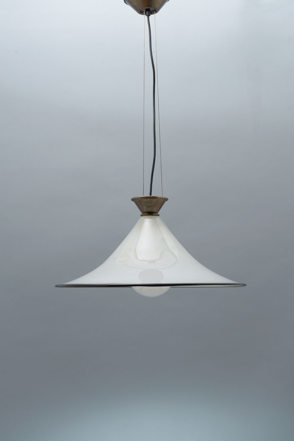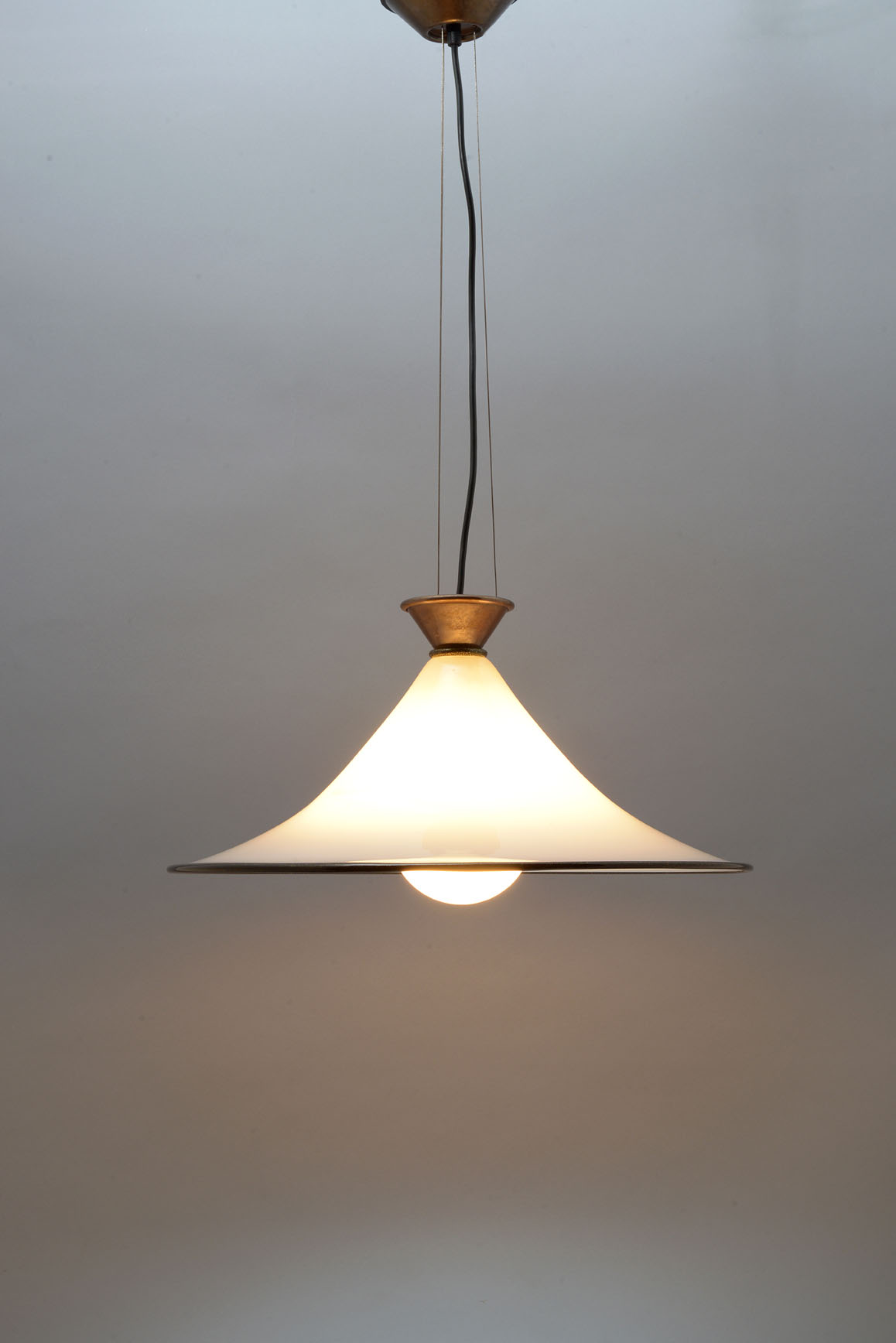 Clear overlay glass lamp with gold powder glass inclusions in the black edge. Suspended by three steel cables from the ceiling plate to a brass bottom bowl.