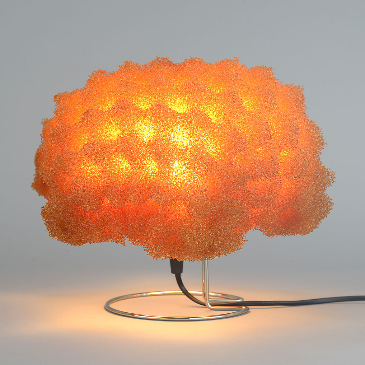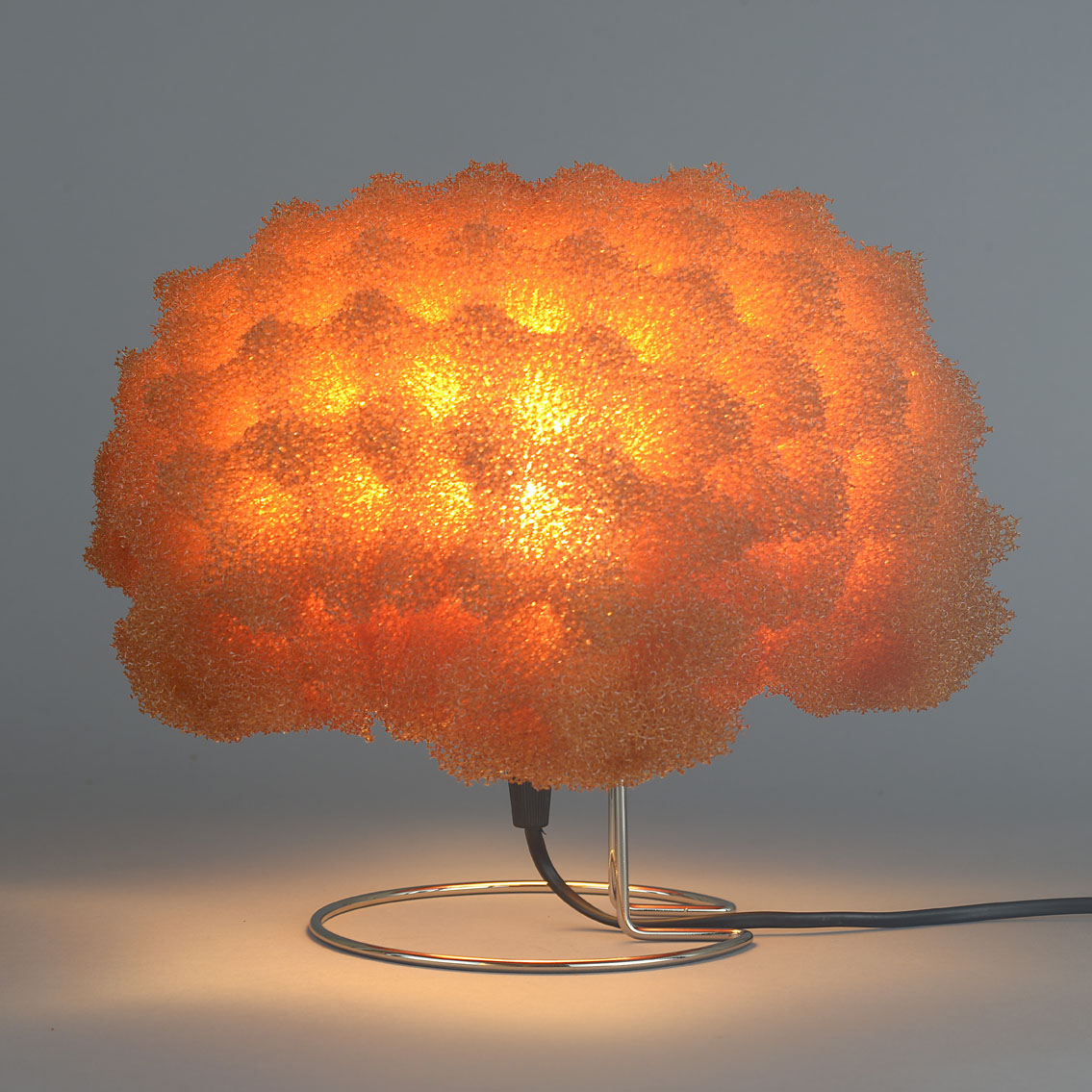 A small table 'sponge' lamp made of orange-coloured polyester foam raised on a chrome-plated metal base. With E14 bulb fittings.
