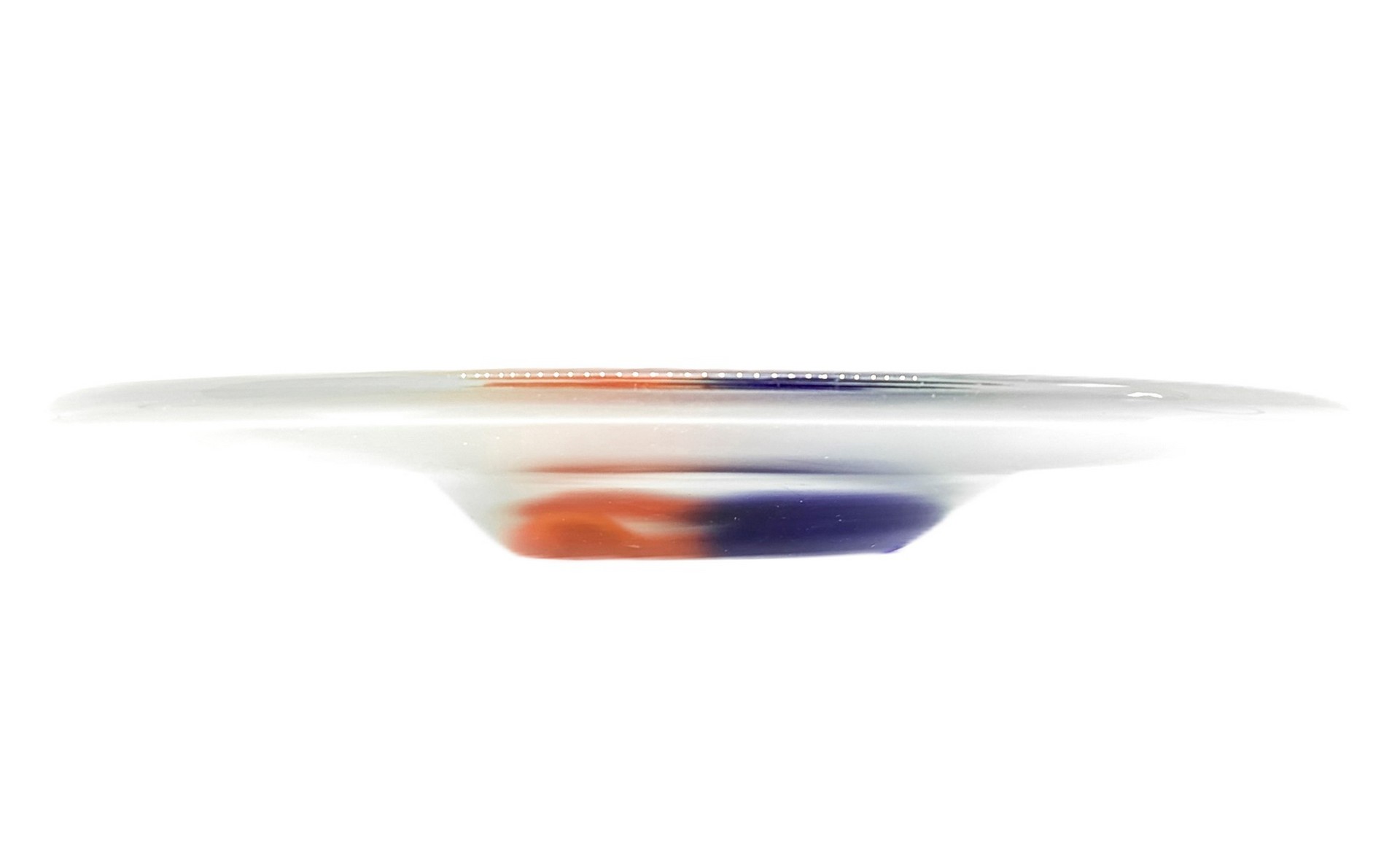 Piccolo centrotavola in vetro di Murano con striature nei toni del blu e centro marrone, Ioan Tamaia Diametro cm 23,5 Romania, XX secolo. Firmato Tomaian.Romania, XX secolo. Firmato Tomaian.