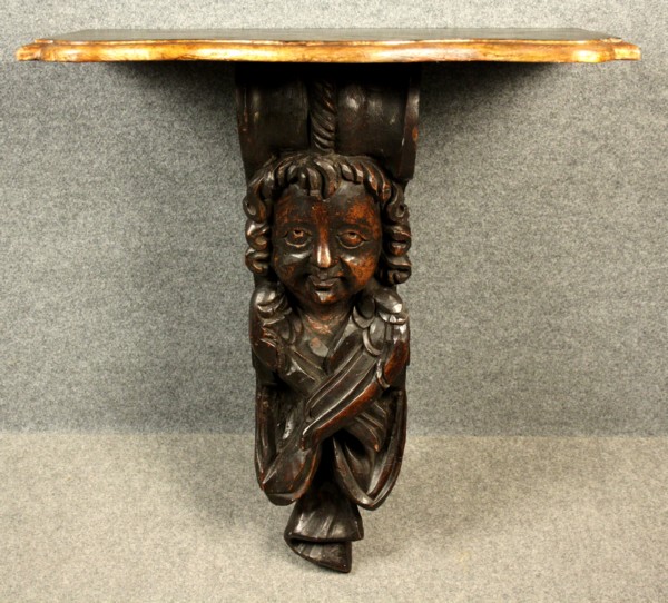 Firmato. Esemplare: 1 di 20. Mensola formata da un antico fregio in legno intagliato raff. ''ANGELO'' con piano in finto marmo. Mis. Lung. cm. 60 Alt. cm. 69 Prof. cm. 29 ca.